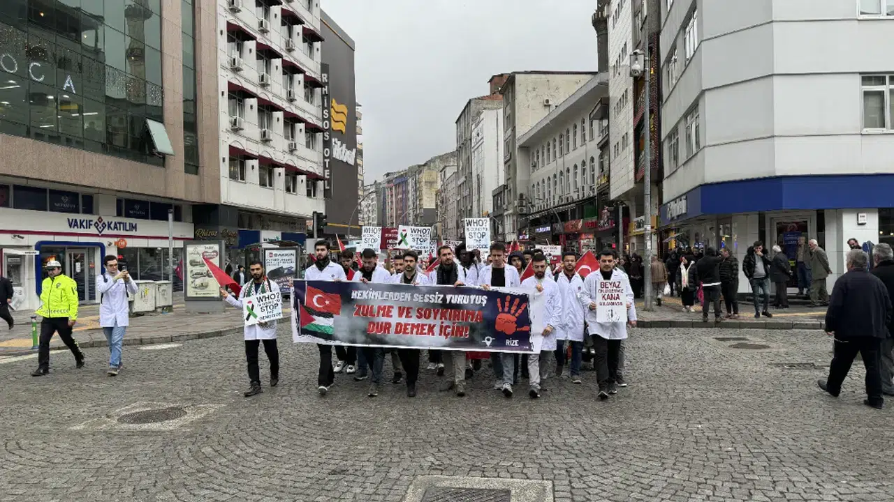 Rize'de doktorlar ve Recep Tayyip Erdoğan Üniversitesi Tıp Fakültesi öğrencileri, İsrail'in Gazze'ye yönelik saldırılarını protesto için sessiz yürüyüş düzenledi.