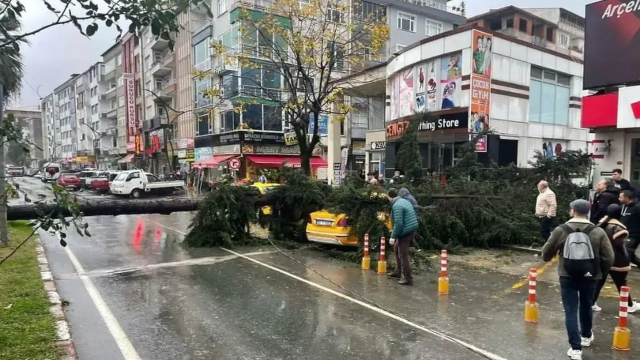 İlçede aralıklarla etkili olan fırtına, hayatı olumsuz etkiledi. Atatürk Caddesi'nde şiddetli rüzgar nedeniyle bir ağaç, park halindeki araçların üzerine devrildi.