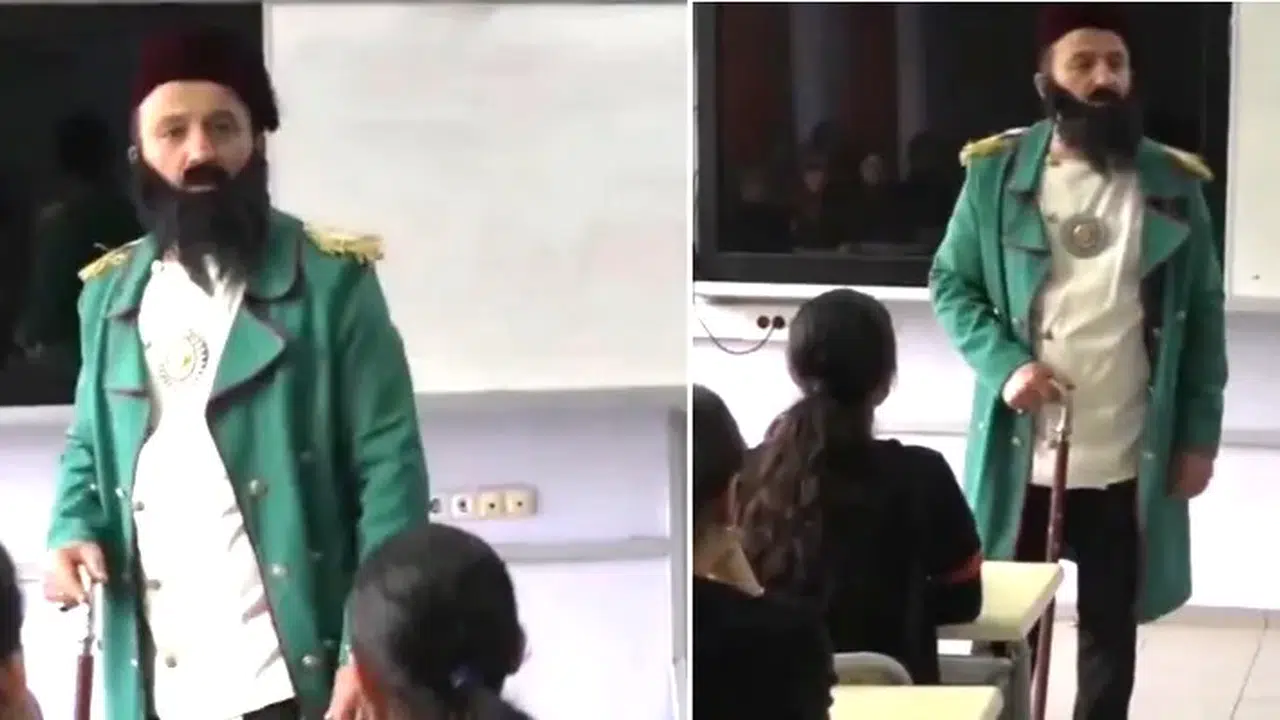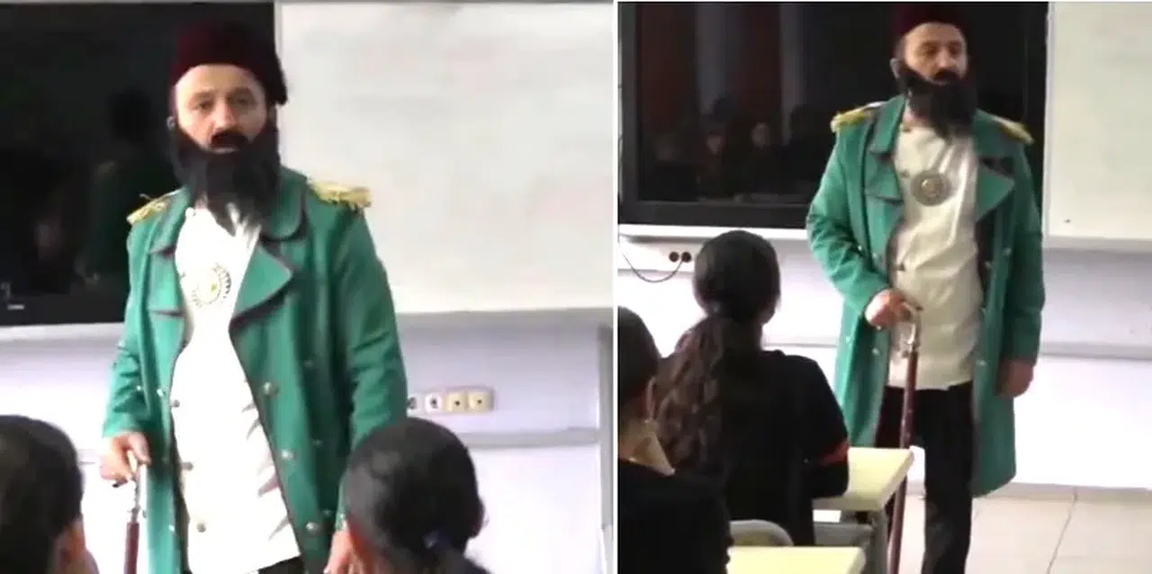 Öğretmen, Osmanlı padişahlarından II. Abdülhamid’in kıyafetlerini giyerek derse katıldı ve dersi bu tarihi karakterin perspektifinden anlattı.