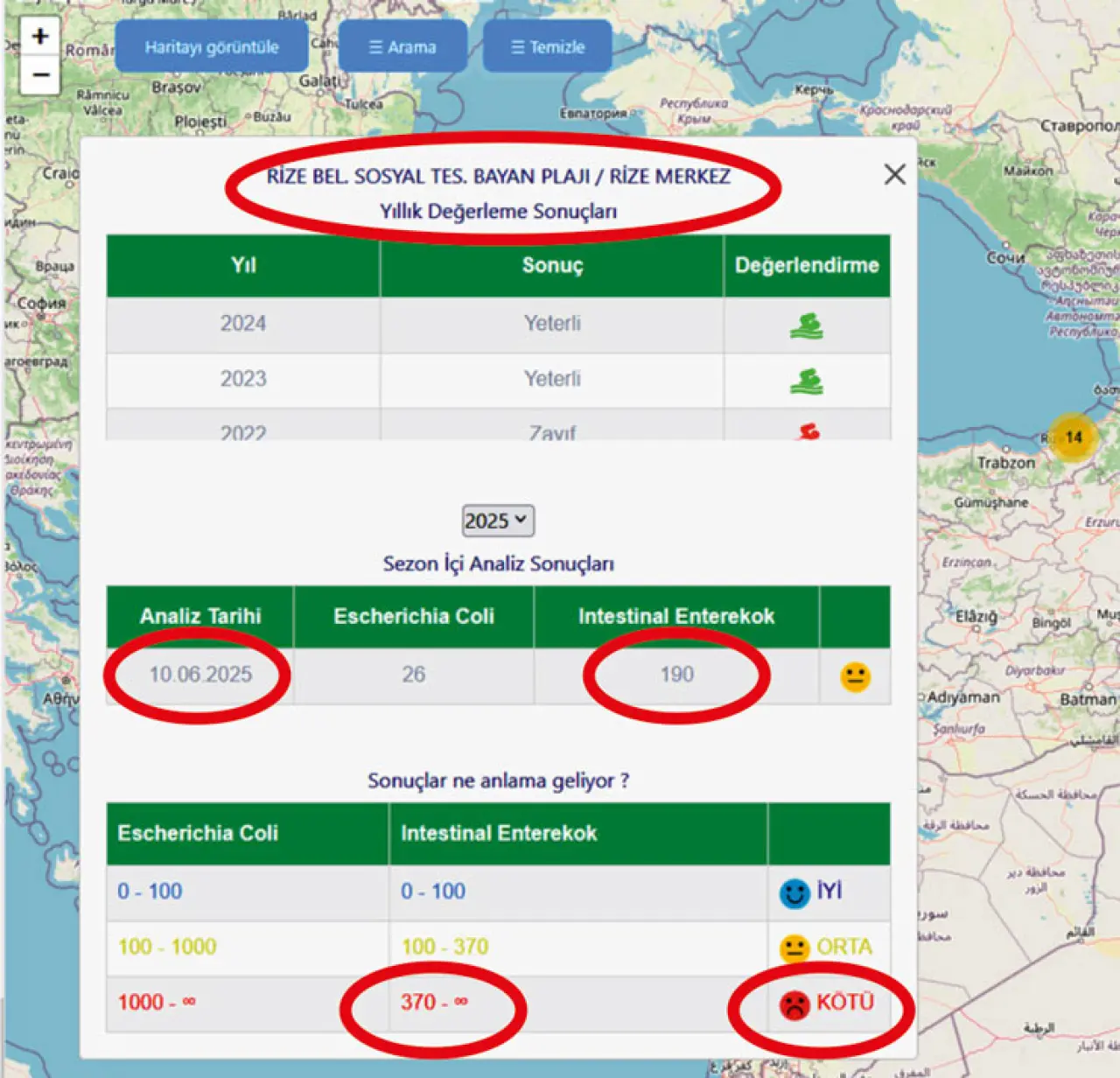 Sağlık Bakanlığı Halk Sağlığı Genel Müdürlüğü tarafından birey ve toplum sağlığının korunması amacıyla geliştirilen Yüzme Suyu Takip Sistemi kapsamında Rize'deki yüzme alanlarının su kalitesine ait analiz sonuçları açıklandı. Yaz sezonunun başlamasıyla birlikte artan sıcaklıklarda serinlemek isteyenlerin gözde mekânlarından olan plajlar için yapılan son deniz suyu analizleri Rize’de endişe verici sonuçlar da ortaya koydu. Özellikle Rize Belediyesi Sosyal Tesisleri Alipaşa Kadınlar Plajı'nda denize girecek kadınların ve çocukların olası sağlık risklerine karşı dikkatli olması gerekiyor.