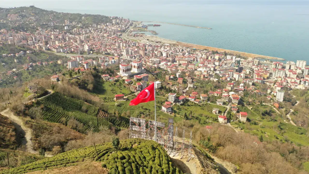 Rize Belediyesi tarafından Fatih Mahallesinde “Rize” yazısı ve dev Türk Bayrağı yerleştiriliyor.
