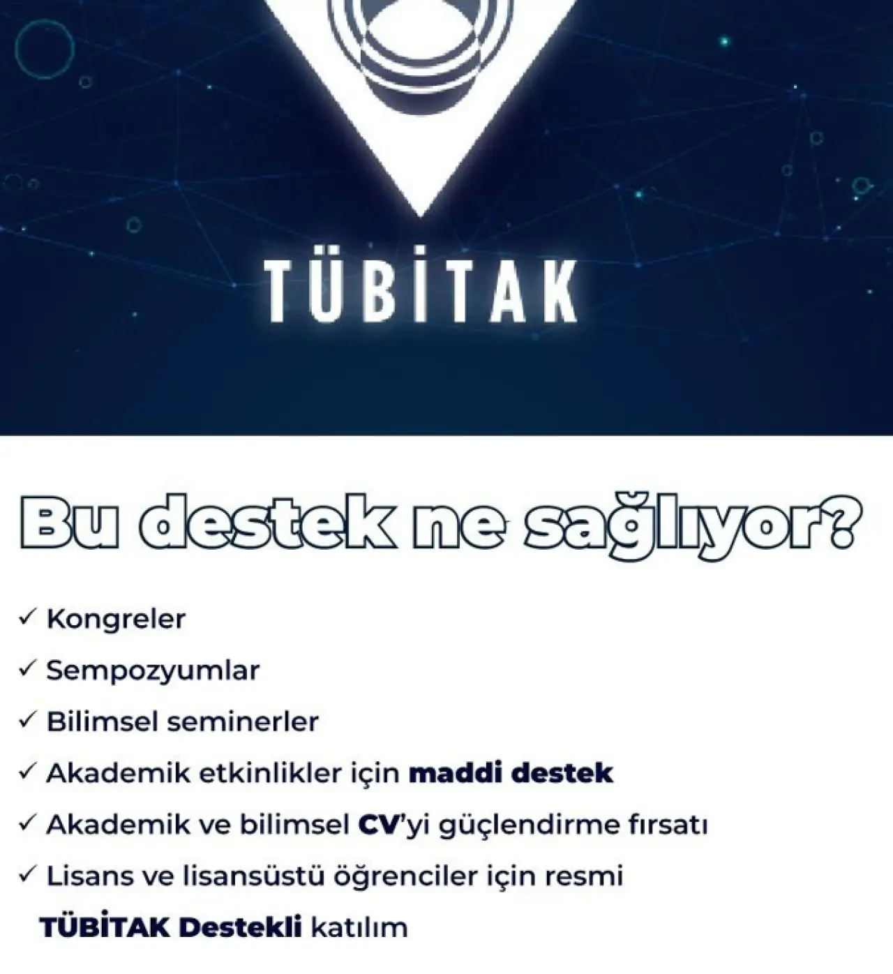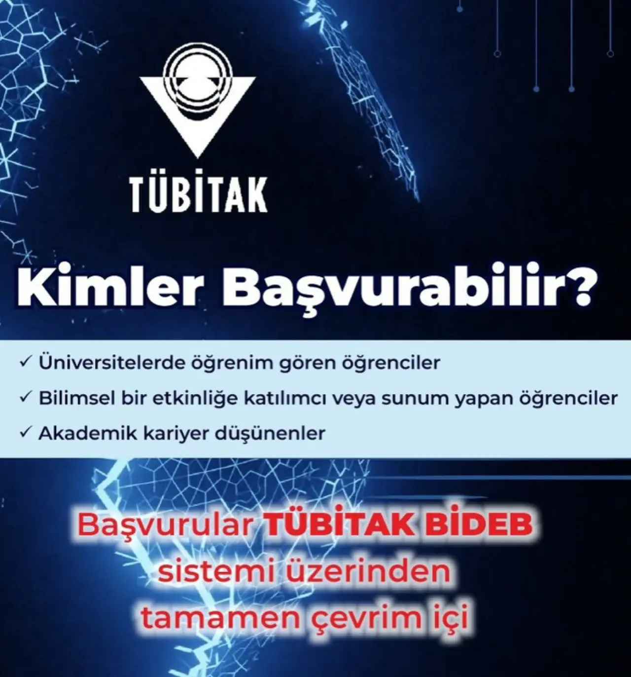 Üniversite yönetimi, bilimsel çalışmalarını ulusal ve uluslararası platformlarda sunmak isteyen öğrencileri başvuru yapmaya davet etti. Destekten yararlanmak isteyen adayların başvurularını TÜBİTAK BİDEB sistemi üzerinden çevrim içi olarak gerçekleştirmesi gerekiyor.