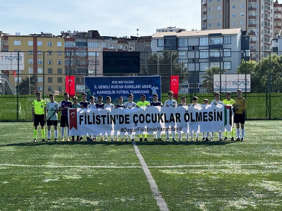 Final maçında karşılaşan Pazarköy Abdulgafur Kart Kur’an Kursu ile İyidere Hazar Mahallesi Köprübaşı Kur’an Kursu “Filistin’de Çocuklar Ölmesin” pankartıyla sahaya çıkarak İsrail zulmüne uğrayan Filistinli çocukların yaşadığı drama dikkat çekti.