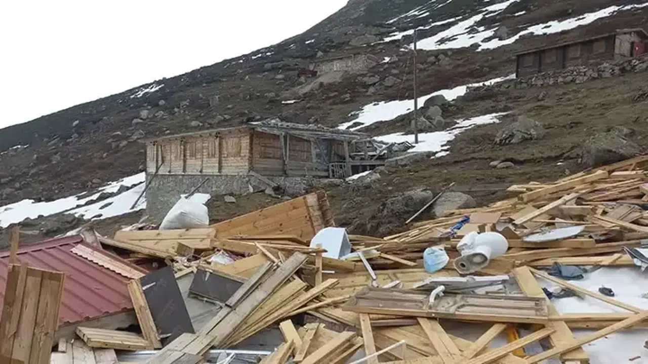 Rize'nin Çamlıhemşin ilçesine bağlı Kavrun Yaylası'na çıkan köylüler, kışın yağan kar ve meydana gelen çığda 6 evin yıkıldığını tespit etti.