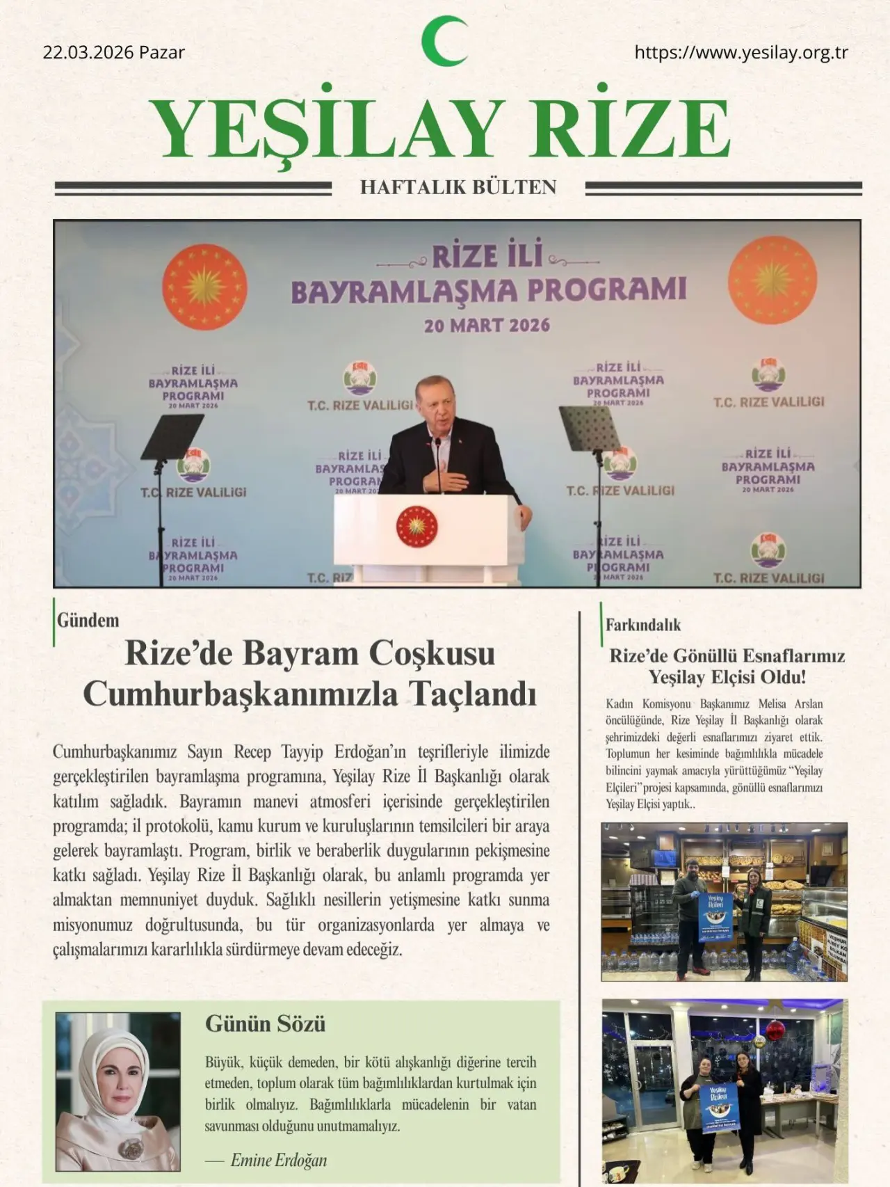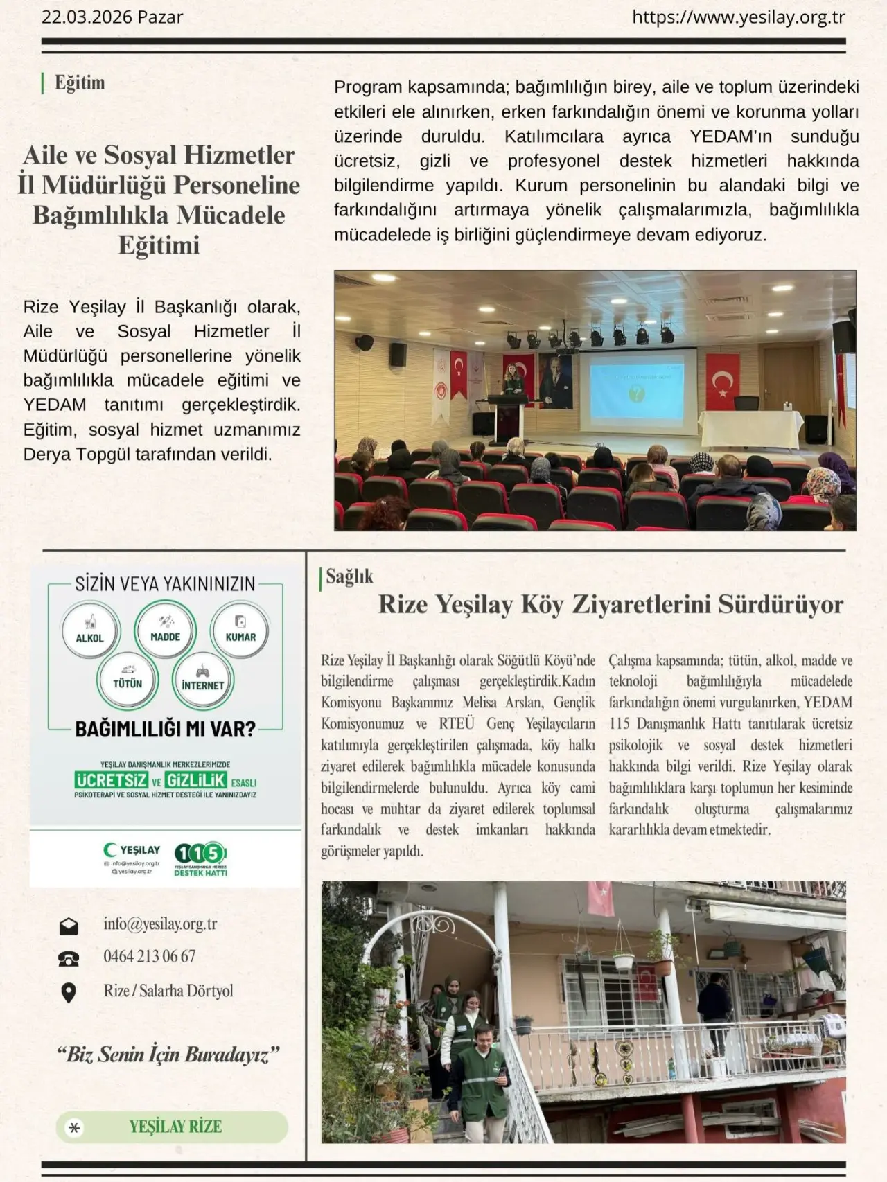 Yeşilay Rize İl Başkanlığı, 22 Mart 2026 tarihli haftalık bültenini kamuoyuyla paylaştı. Bağımlılıkla mücadele ve sağlıklı yaşam bilincinin yaygınlaştırılması amacıyla yürütülen çalışmaların hız kesmeden devam ettiği belirtildi.