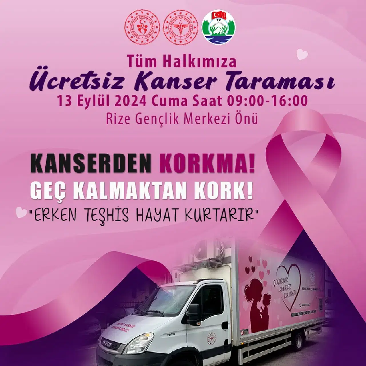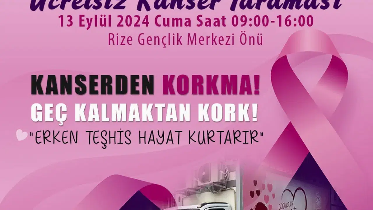 Rize İl Sağlık Müdürlüğünce 2024 yılı kanser taramalarında “Altın Yıl” ilan edilmiş olup, erken teşhis ve tedavi için tarama çalışmaları kapsamında Rize Gençlik ve Spor İl Müdürlüğü önünde gün boyunca hazır olacak olan kanser tarama aracı sayesinde gönüllü personelin kanser taramaları yapılacaktır.