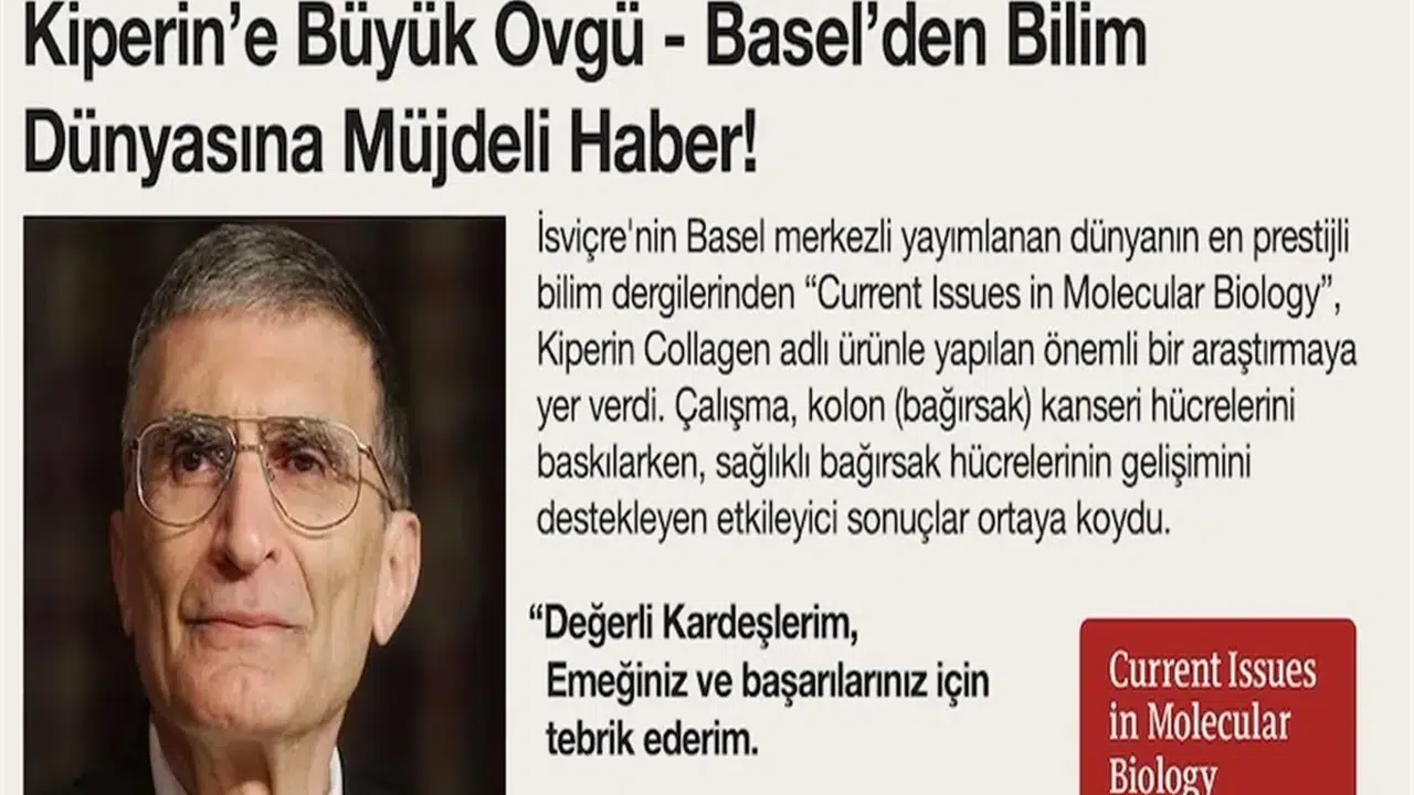 Zihin, ruh ve beden sağlığını desteklemek üzere 2019’dan bu yana bilim ve Ar-Ge’ye yatırım yapan ilaç şirketi Kiperin’in ‘Kiperin Collagen’ adlı ürününün bağırsak sağlığına ve kolon kanserine etkisi odağında gerçekleştirdiği araştırma, İsviçre merkezli prestijli bilim dergisi ‘Current Issues in Molecular Biology’de yayımlandı. Nobel Kimya Ödülü sahibi Prof. Dr. Aziz Sancar da sağlıklı bağırsak hücrelerinin gelişimi için sonuçlar ortaya koyan çalışmayı gerçekleştiren ekibe tebrik mesajı gönderdi.