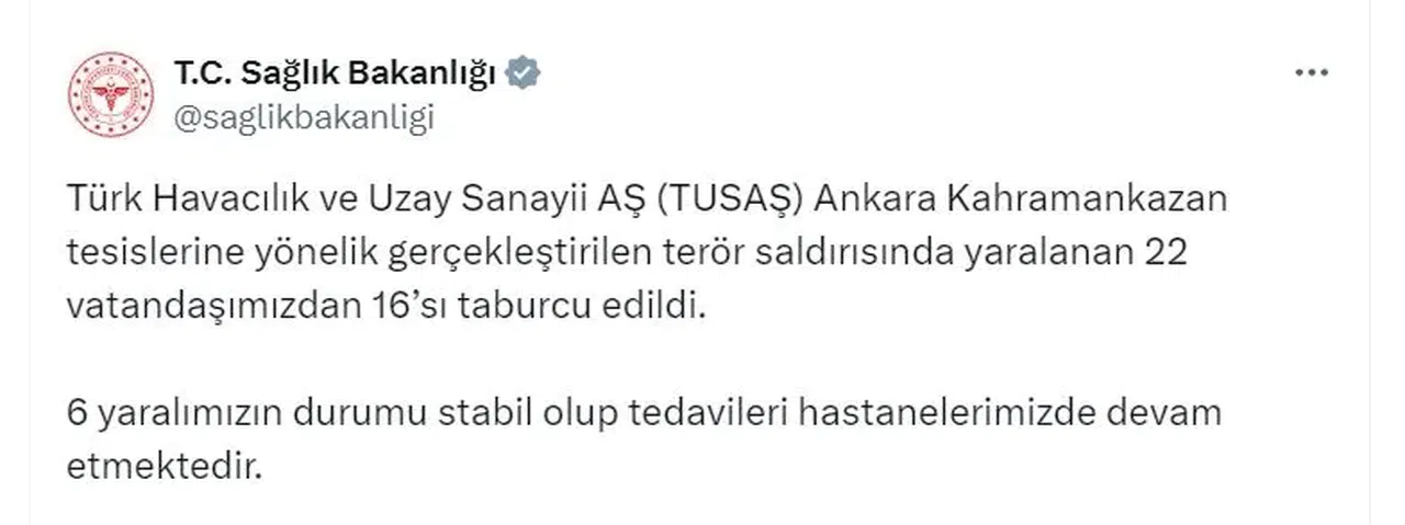 Bakanlığın sosyal medya hesabından yapılan açıklamada, “Türk Havacılık ve Uzay Sanayii AŞ (TUSAŞ) Ankara Kahramankazan tesislerine yönelik gerçekleştirilen terör saldırısında yaralanan 22 vatandaşımızdan 16’sı taburcu edildi. 6 yaralımızın durumu stabil olup tedavileri hastanelerimizde devam etmektedir” denildi.