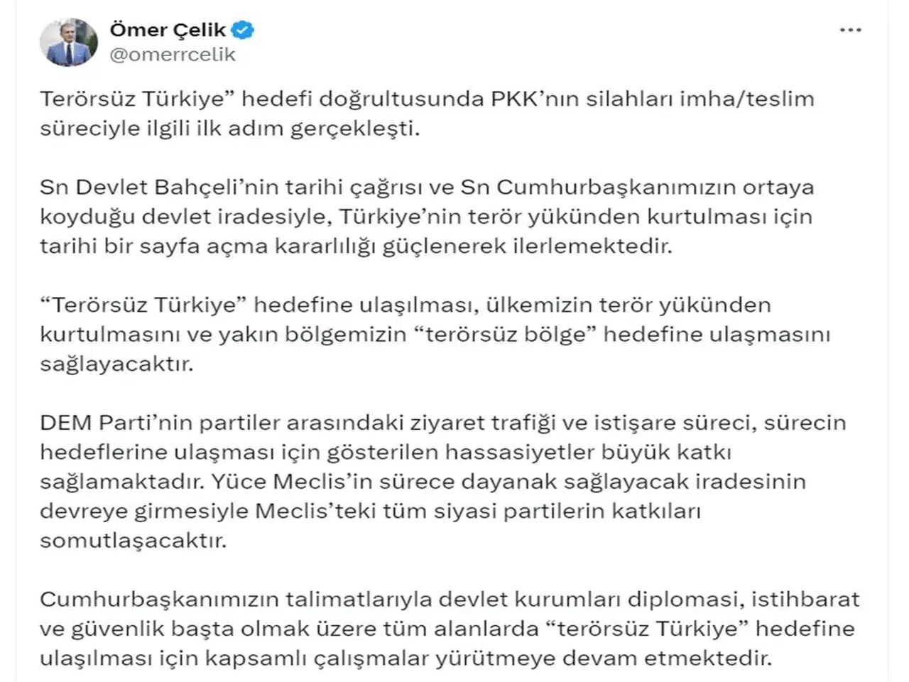 AK Parti Genel Başkan Yardımcısı ve Parti Sözcüsü Ömer Çelik, terör örgütü PKK'nın silah bırakmasına ilişkin, "Gelinen aşamada 'Terörsüz Türkiye' hedefine ulaşılması için kritik bir eşik geçilmiştir. Bundan sonrasında PKK'nın tüm şubeleri ve illegal yapılarıyla feshi ve silahların yakılması/teslim edilmesi süreci kısa zaman içinde tamamlanmalıdır" dedi.