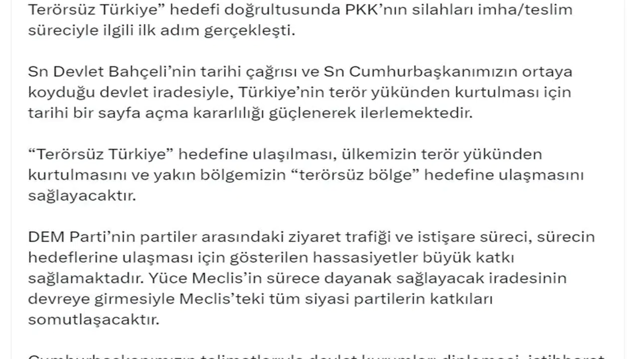 AK Parti Sözcüsü Çelik, sosyal medya hesabından yaptığı açıklamada, "Terörsüz Türkiye' hedefi doğrultusunda PKK'nın silahları imha/teslim süreciyle ilgili ilk adım gerçekleşti. Sayın Devlet Bahçeli’nin tarihi çağrısı ve Sayın Cumhurbaşkanımızın ortaya koyduğu devlet iradesiyle, Türkiye’nin terör yükünden kurtulması için tarihi bir sayfa açma kararlılığı güçlenerek ilerlemektedir. 'Terörsüz Türkiye' hedefine ulaşılması, ülkemizin terör yükünden kurtulmasını ve yakın bölgemizin 'terörsüz bölge' hedefine ulaşmasını sağlayacaktır. DEM Parti’nin partiler arasındaki ziyaret trafiği ve istişare süreci, sürecin hedeflerine ulaşması için gösterilen hassasiyetler büyük katkı sağlamaktadır. Yüce Meclis’in sürece dayanak sağlayacak iradesinin devreye girmesiyle Meclis’teki tüm siyasi partilerin katkıları somutlaşacaktır. Cumhurbaşkanımızın talimatlarıyla devlet kurumları diplomasi, istihbarat ve güvenlik başta olmak üzere tüm alanlarda 'Terörsüz Türkiye' hedefine ulaşılması için kapsamlı çalışmalar yürütmeye devam etmektedir" dedi.
