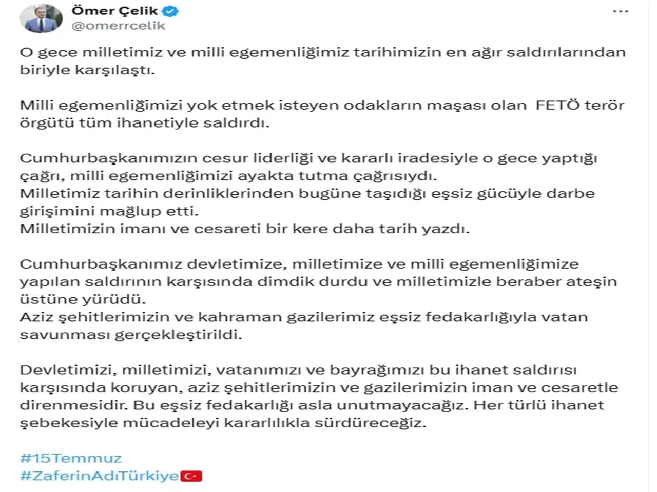 AK Parti Sözcüsü Ömer Çelik, 15 Temmuz darbe girişiminin yıl dönümü mesajında, "Milletimiz tarihin derinliklerinden bugüne taşıdığı eşsiz gücüyle darbe girişimini mağlup etti. Milletimizin imanı ve cesareti bir kere daha tarih yazdı" dedi.