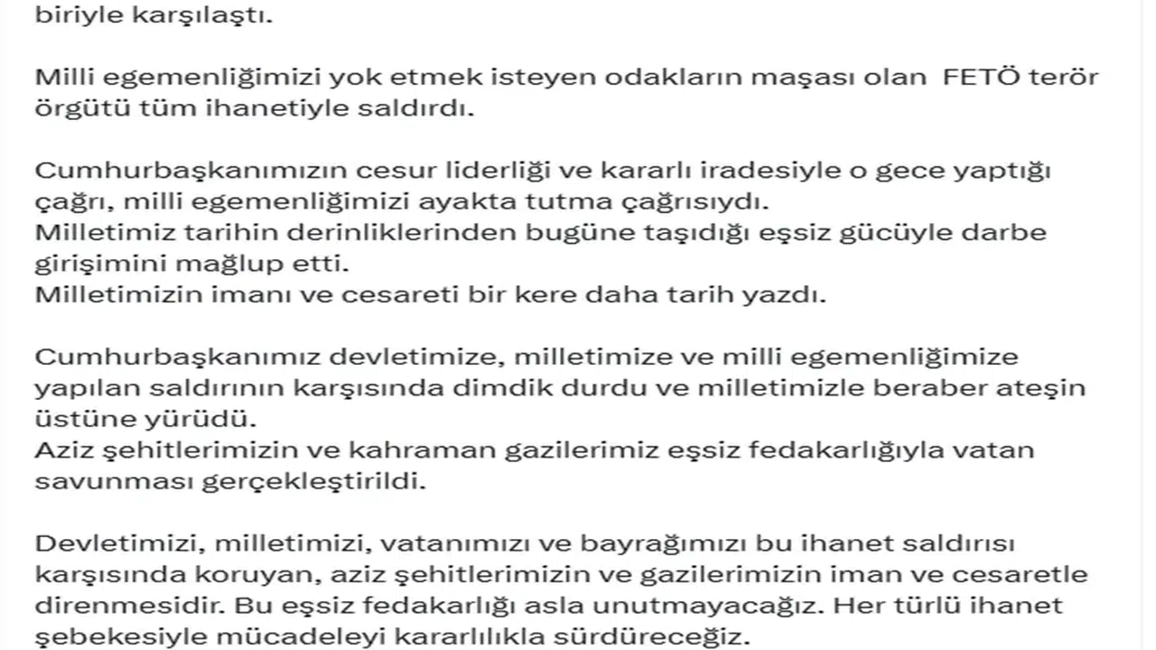 AK Parti'li Çelik, sosyal medya hesabından 15 Temmuz darbe girişiminin yıl dönümü nedeniyle mesaj paylaştı. Çelik, "O gece milletimiz ve milli egemenliğimiz tarihimizin en ağır saldırılarından biriyle karşılaştı. Milli egemenliğimizi yok etmek isteyen odakların maşası olan FETÖ terör örgütü tüm ihanetiyle saldırdı. Cumhurbaşkanımızın cesur liderliği ve kararlı iradesiyle o gece yaptığı çağrı, milli egemenliğimizi ayakta tutma çağrısıydı. Milletimiz tarihin derinliklerinden bugüne taşıdığı eşsiz gücüyle darbe girişimini mağlup etti. Milletimizin imanı ve cesareti bir kere daha tarih yazdı. Cumhurbaşkanımız devletimize, milletimize ve milli egemenliğimize yapılan saldırının karşısında dimdik durdu ve milletimizle beraber ateşin üstüne yürüdü. Aziz şehitlerimizin ve kahraman gazilerimiz eşsiz fedakarlığıyla vatan savunması gerçekleştirildi. Devletimizi, milletimizi, vatanımızı ve bayrağımızı bu ihanet saldırısı karşısında koruyan, aziz şehitlerimizin ve gazilerimizin iman ve cesaretle direnmesidir. Bu eşsiz fedakarlığı asla unutmayacağız. Her türlü ihanet şebekesiyle mücadeleyi kararlılıkla sürdüreceğiz" ifadelerini kulland