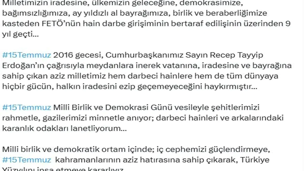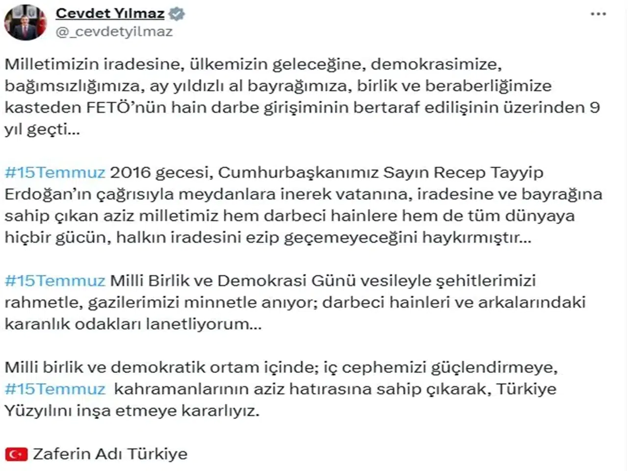 Cumhurbaşkanı Yardımcısı Cevdet Yılmaz, sosyal medya hesabından yaptığı açıklamada, "Milletimizin iradesine, ülkemizin geleceğine, demokrasimize, bağımsızlığımıza, ay yıldızlı al bayrağımıza, birlik ve beraberliğimize kasteden FETÖ’nün hain darbe girişiminin bertaraf edilişinin üzerinden 9 yıl geçti. 15 Temmuz 2016 gecesi, Cumhurbaşkanımız Sayın Recep Tayyip Erdoğan’ın çağrısıyla meydanlara inerek vatanına, iradesine ve bayrağına sahip çıkan aziz milletimiz hem darbeci hainlere hem de tüm dünyaya hiçbir gücün, halkın iradesini ezip geçemeyeceğini haykırmıştır. 15 Temmuz Milli Birlik ve Demokrasi Günü vesileyle şehitlerimizi rahmetle, gazilerimizi minnetle anıyor; darbeci hainleri ve arkalarındaki karanlık odakları lanetliyorum. Milli birlik ve demokratik ortam içinde; iç cephemizi güçlendirmeye, 15 Temmuz kahramanlarının aziz hatırasına sahip çıkarak, Türkiye Yüzyılını inşa etmeye kararlıyız. Zaferin Adı Türkiye" dedi.