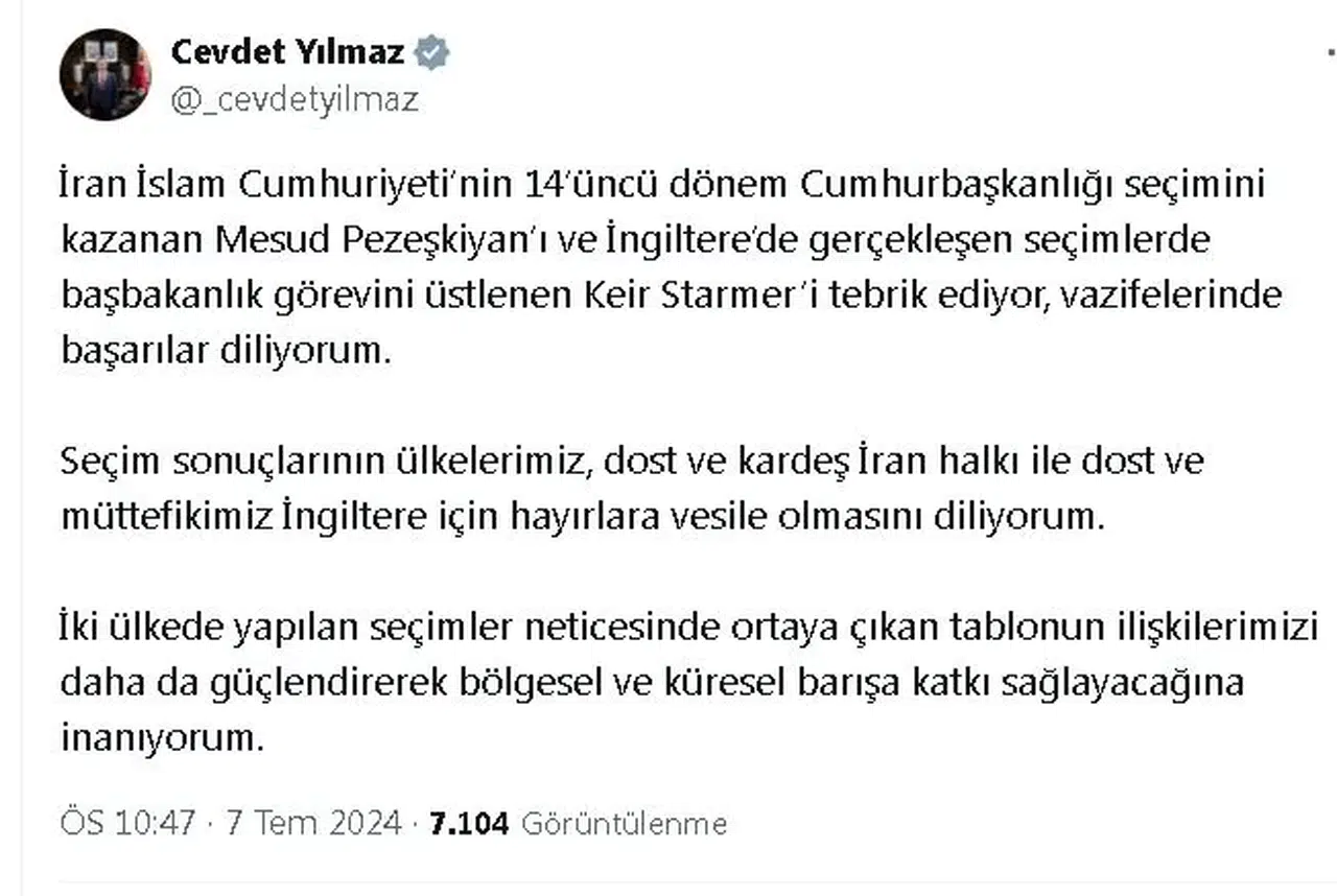CUMHURBAŞKANI Yardımcısı Cevdet Yılmaz, İran İslam Cumhuriyeti’nin 14’üncü dönem Cumhurbaşkanlığı seçimini kazanan Mesud Pezeşkiyan’ı ve İngiltere’de gerçekleşen seçimlerde başbakanlık görevini üstlenen Keir Starmer’i tebrik etti.