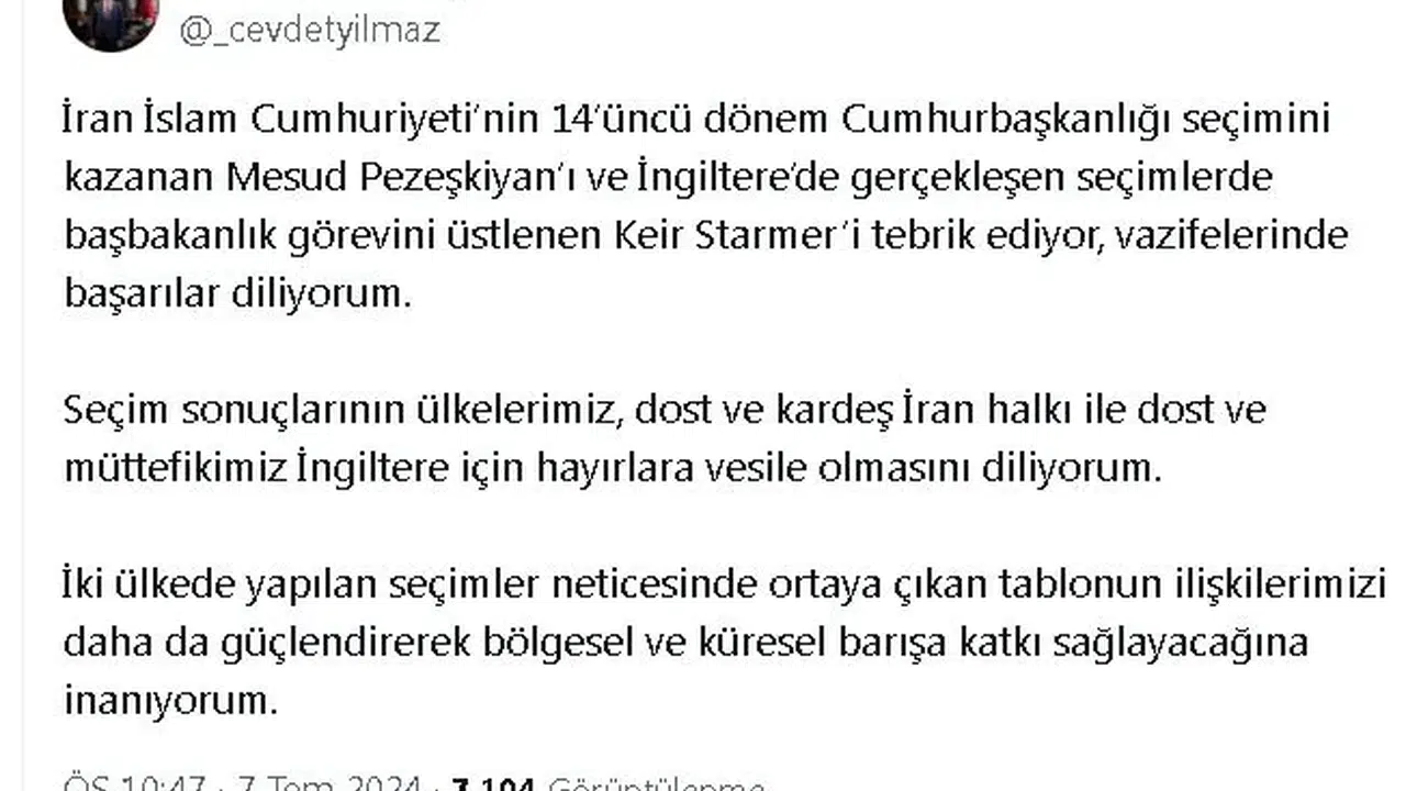 Cumhurbaşkanı Yardımcısı Yılmaz, sosyal medya hesabı üzerinden yayınladığı tebrik mesajında, “İran İslam Cumhuriyeti’nin 14’üncü dönem Cumhurbaşkanlığı seçimini kazanan Mesud Pezeşkiyan’ı ve İngiltere’de gerçekleşen seçimlerde başbakanlık görevini üstlenen Keir Starmer’i tebrik ediyor, vazifelerinde başarılar diliyorum. Seçim sonuçlarının ülkelerimiz, dost ve kardeş İran halkı ile dost ve müttefikimiz İngiltere için hayırlara vesile olmasını diliyorum. İki ülkede yapılan seçimler neticesinde ortaya çıkan tablonun ilişkilerimizi daha da güçlendirerek bölgesel ve küresel barışa katkı sağlayacağına inanıyorum” dedi.