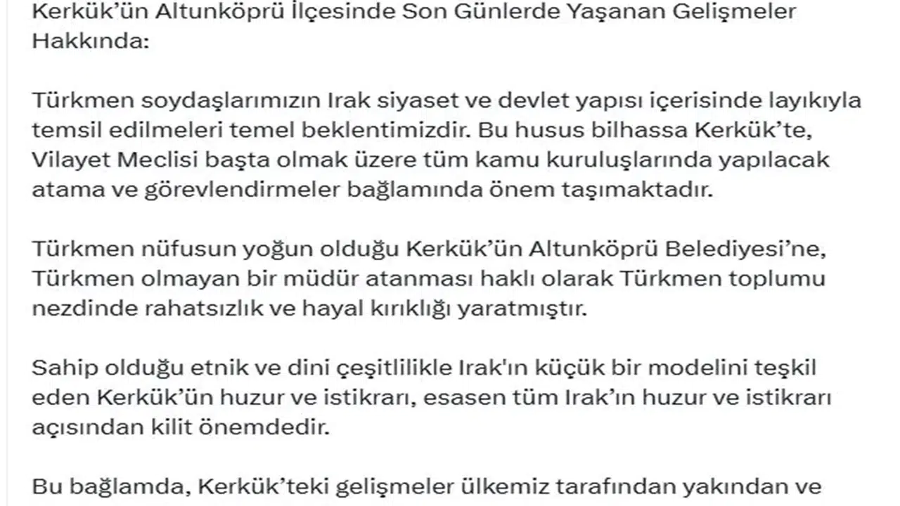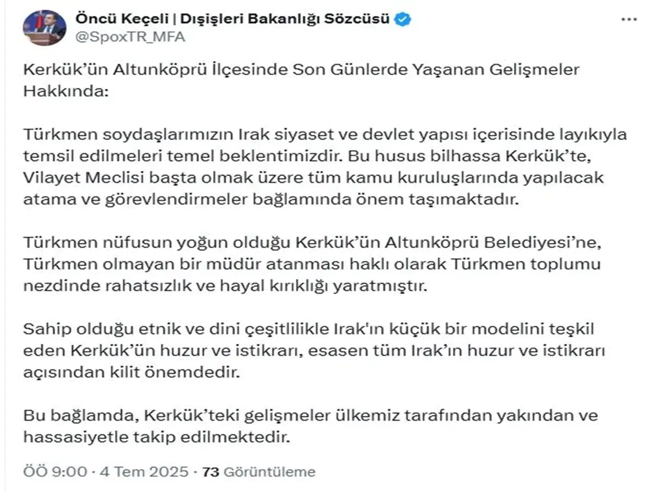Dışişleri Sözcüsü Keçeli, sosyal medya hesabından yaptığı açıklamada, "Türkmen soydaşlarımızın Irak siyaset ve devlet yapısı içerisinde layıkıyla temsil edilmeleri temel beklentimizdir. Bu husus bilhassa Kerkük'te, Vilayet Meclisi başta olmak üzere tüm kamu kuruluşlarında yapılacak atama ve görevlendirmeler bağlamında önem taşımaktadır. Türkmen nüfusun yoğun olduğu Kerkük'ün Altunköprü Belediyesi'ne, Türkmen olmayan bir müdür atanması haklı olarak Türkmen toplumu nezdinde rahatsızlık ve hayal kırıklığı yaratmıştır. Sahip olduğu etnik ve dini çeşitlilikle Irak'ın küçük bir modelini teşkil eden Kerkük'ün huzur ve istikrarı, esasen tüm Irak'ın huzur ve istikrarı açısından kilit önemdedir. Bu bağlamda, Kerkük'teki gelişmeler ülkemiz tarafından yakından ve hassasiyetle takip edilmektedir" dedi.
