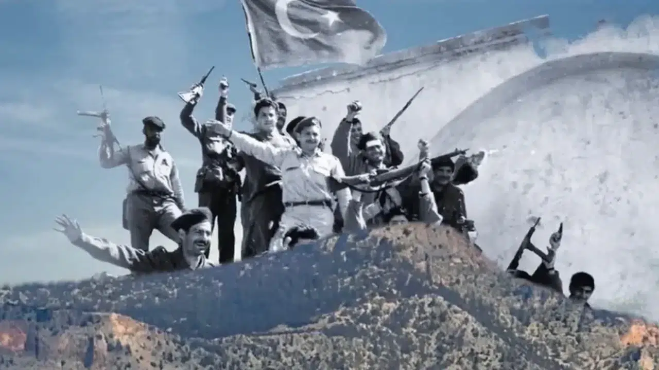 Videoda Kıbrıs’taki Türk mücahitler diye EOKA terör örgütü mensuplarının yer aldığı bir fotoğraf kullanıldı. Söz konusu fotoğrafta, 23 Nisan 1964’te EOKA’lı teröristlerin ele geçirdiği Türk bayrağı görülüyor.