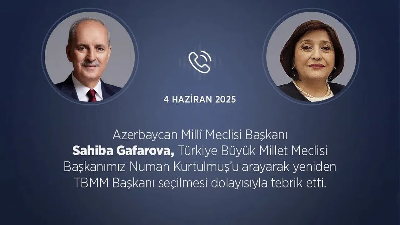 TBMM Başkanlığı'ndan yapılan açıklamaya göre; Azerbaycan Milli Meclisi Başkanı Sahiba Gafarova, Meclis Başkanı Numan Kurtulmuş'u telefonla arayarak yeniden TBMM Başkanı seçilmesi dolayısıyla tebrik etti. Gafarova görüşmede, Kurtulmuş'un Meclis Başkanlığı'na yeniden seçilmesinin TBMM ve Türkiye için hayırlı olmasını diledi. Gafarova ve Kurtulmuş, birbirlerinin Kurban Bayramı'nı tebrik etti.