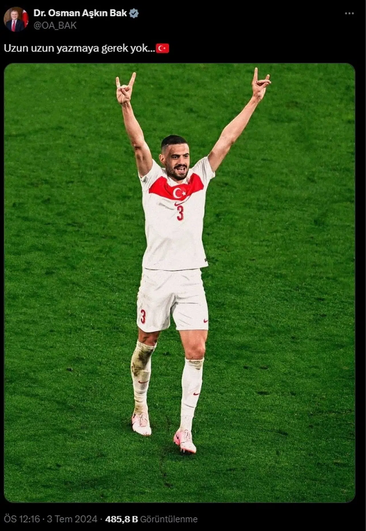 İSTANBUL, (DHA) - Gençlik ve Spor Bakanı Dr. Osman Aşkın Bak, milli futbolcu Merih Demiral’a sosyal medya hesabından destek paylaşımında bulundu.