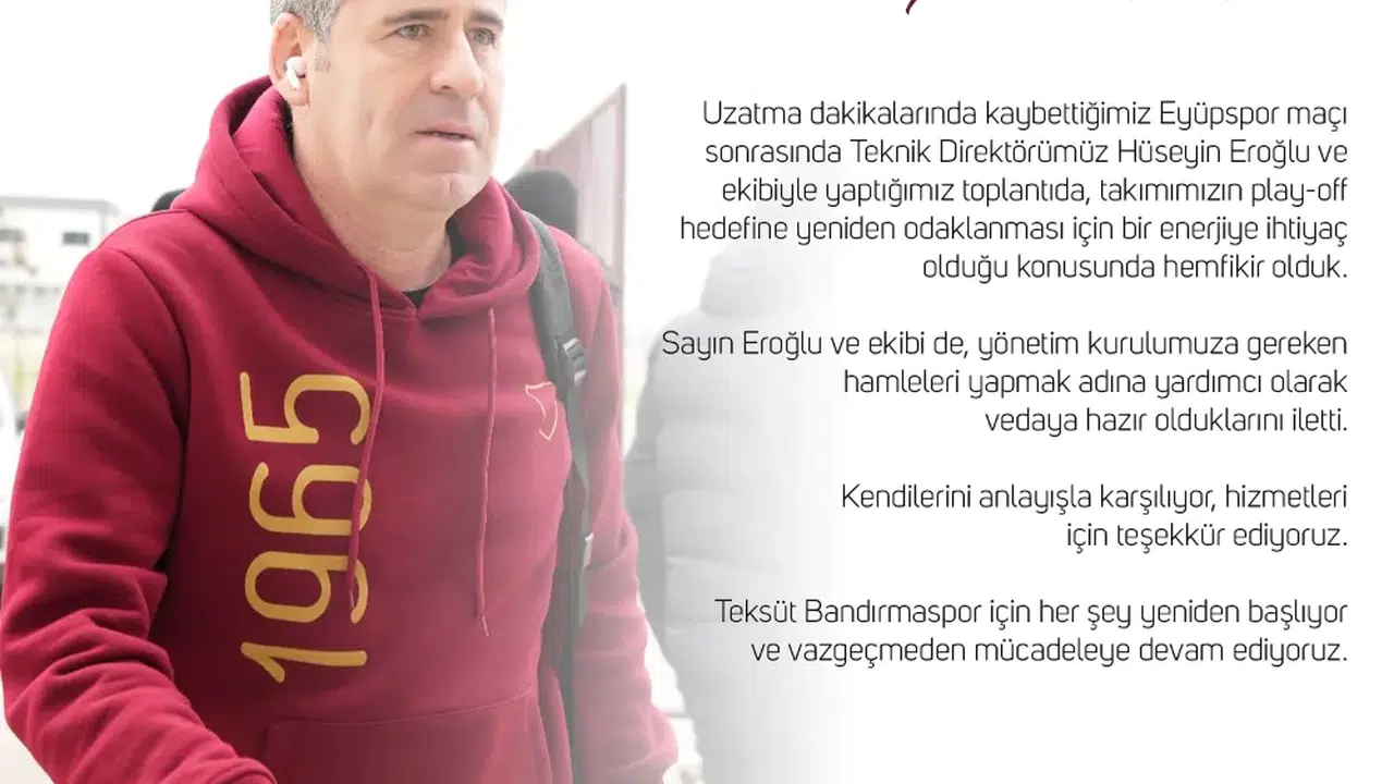 "Uzatma dakikalarında kaybettiğimiz Eyüpspor maçı sonrasında Teknik Direktörümüz Hüseyin Eroğlu ve ekibiyle yaptığımız toplantıda, takımımızın play-off hedefine yeniden odaklanması için bir enerjiye ihtiyaç olduğu konusunda hemfikir olduk. Sayın Eroğlu ve ekibi de yönetim kurulumuza gereken hamleleri yapmak adına yardımcı olarak vedaya hazır olduklarını iletti. Kendilerini anlayışla karşılıyor, hizmetleri için teşekkür ediyoruz.Bandırmaspor için her şey yeniden başlıyor ve vazgeçmeden mücadeleye devam ediyoruz."
