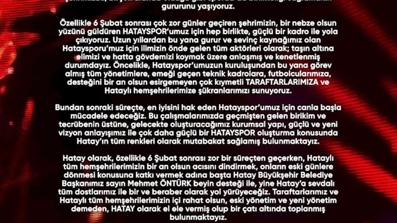 "Hatayspor'umuz için hep birlikte, güçlü bir kadro ile yola çıkıyoruz. Uzun yıllardan bu yana gurur ve sevinç kaynağımız olan Hataysporu’muz için ilimizin önde gelen tüm aktörleri olarak; taşın altına elimizi ve hatta gövdemizi koymak üzere anlaşmış ve kenetlenmiş durumdayız. Öncelikle, Hatayspor’umuzun kuruluşundan bu yana görev almış tüm yönetimlere, emeği geçen teknik kadrolara, futbolcularımıza, desteğini bir an olsun esirgemeyen çok kıymetli taraftarlarımıza ve Hataylı hemşehrilerimize şükranlarımızı sunuyoruz. Bundan sonraki süreçte, en iyisini hak eden Hatayspor’umuz için canla başla mücadele edeceğiz. Bu çalışmalarımızda geçmişten gelen birikim ve tecrübenin üstüne, gelecekte oluşturacağımız kurumsal yapı, güçlü ve yeni vizyon anlayışımız ile çok daha güçlü bir Hatayspor oluşturma konusunda Hatay’ın tüm renkleri olarak mutabakat sağlamış bulunmaktayız. Hatay olarak, özellikle 6 Şubat sonrası zor bir süreçten geçerken, Hataylı tüm hemşehrilerimizin bir an olsun acısını dindirmek, onların eski günlere dönmesi konusuna katkı vermek adına başta Hatay Büyükşehir Belediye Başkanımız Mehmet Öntürk'ün desteği ile, yine Hatay’a sevdalı tüm dostlarımız ile bir ve beraber olarak yol yürüyeceğiz. Taraftarlarımız ve Hataylı tüm hemşehrilerimizin içi rahat olsun, eski yönetim ve yeni yönetim demeden, HATAY olarak el ele vermiş olup bir çatı altında toplanmış bulunmaktayız. Sporun birleştirici gücüne Hatayspor sevgisi de eklenince bu birliktelik ile güçlü bir Hatayspor oluşturmaktır hedefimiz. Tüm Hataylı sporsever ve hemşehrilerimizin keyifle ve gururla izleyeceği bir Hatayspor oluşturma konusunda destek veren tüm yöneticilerimize teşekkür ederken, bugüne kadar bizden bir an olsun desteğini esirgemeyen taraftarlarımızı bundan sonraki süreçte daha fazla birbirimize ve Hatayspor'umuza sahip çıkmaya davet ediyoruz.”