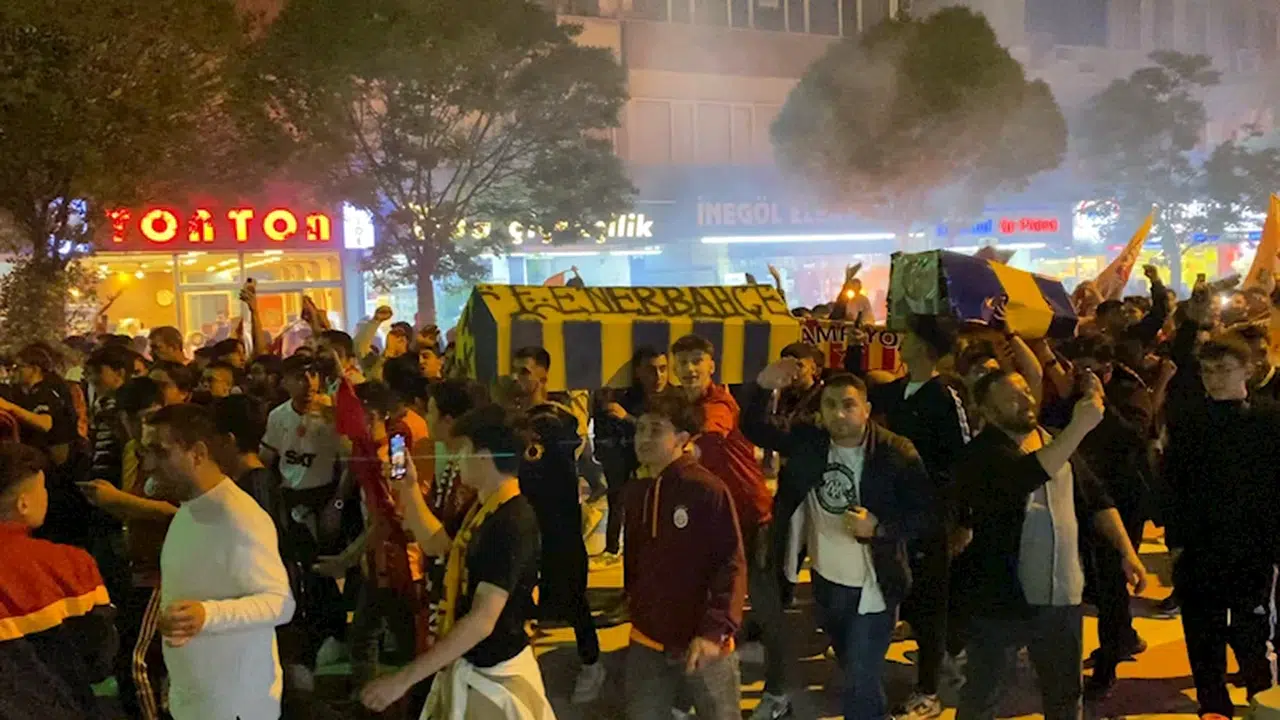 Galatasaray’ın şampiyonluğu Bursa’nın ilçelerinde de kutlanıyor. İnegöl ilçesinde kutlamalara katılan taraftarlar, Fenerbahçe için temsili tabut hazırladığı görüldü. (DHA)