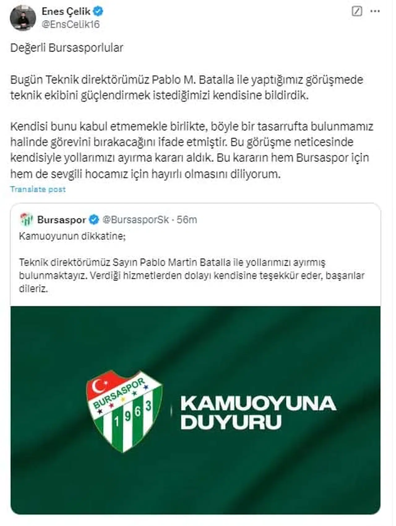 TFF 3. Lig ekiplerinden Bursaspor, teknik direktör Pablo Martin Batalla ile yollarını ayırdıklarını açıkladı. Bursaspor Başkanı Enes Çelik, sosyal medya hesabından yaptığı açıklamada, ''Değerli Bursasporlular. Bugün teknik direktörümüz Pablo M. Batalla ile yaptığımız görüşmede teknik ekibini güçlendirmek istediğimizi kendisine bildirdik. Kendisi bunu kabul etmemekle birlikte, böyle bir tasarrufta bulunmamız halinde görevini bırakacağını ifade etmiştir. Bu görüşme neticesinde kendisiyle yollarımızı ayırma kararı aldık. Bu kararın hem Bursaspor için hem de sevgili hocamız için hayırlı olmasını diliyorum'' dedi. (DHA)