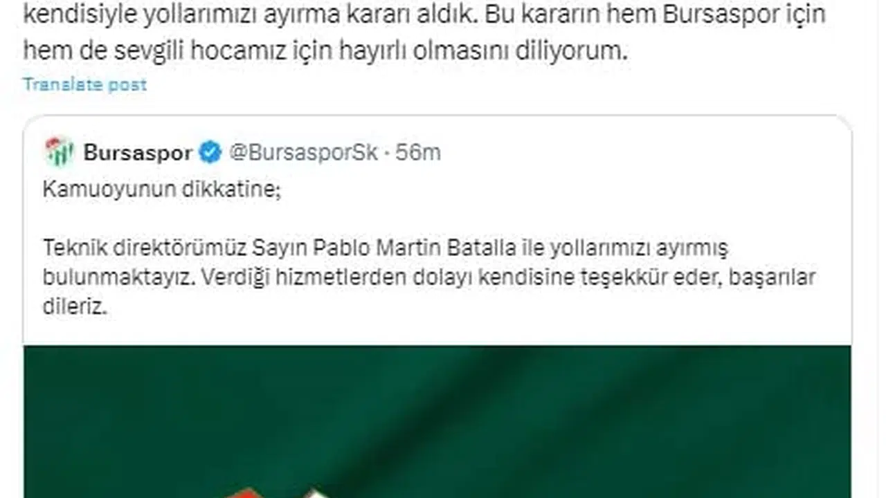 Yiğithan HÜYÜK/BURSA, (DHA)- BURSASPOR, teknik direktörleri Pablo Martin Batalla ile yollarını ayırdı.