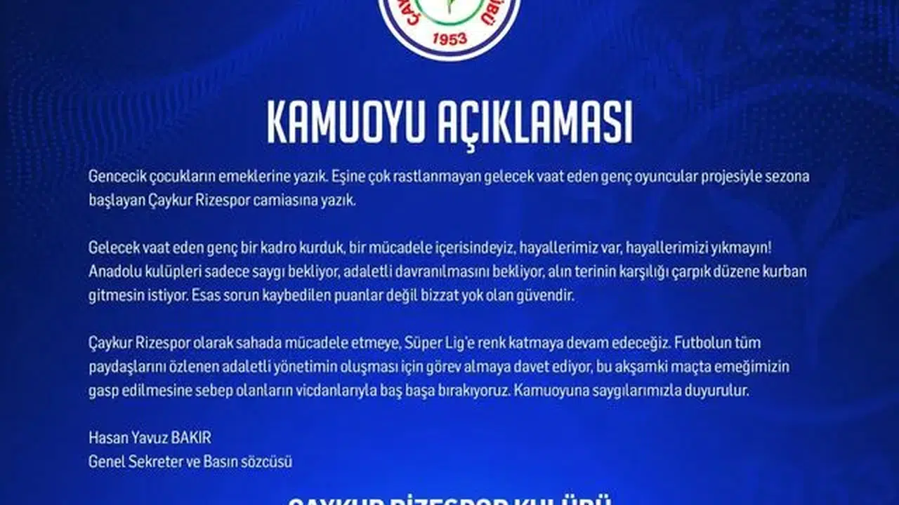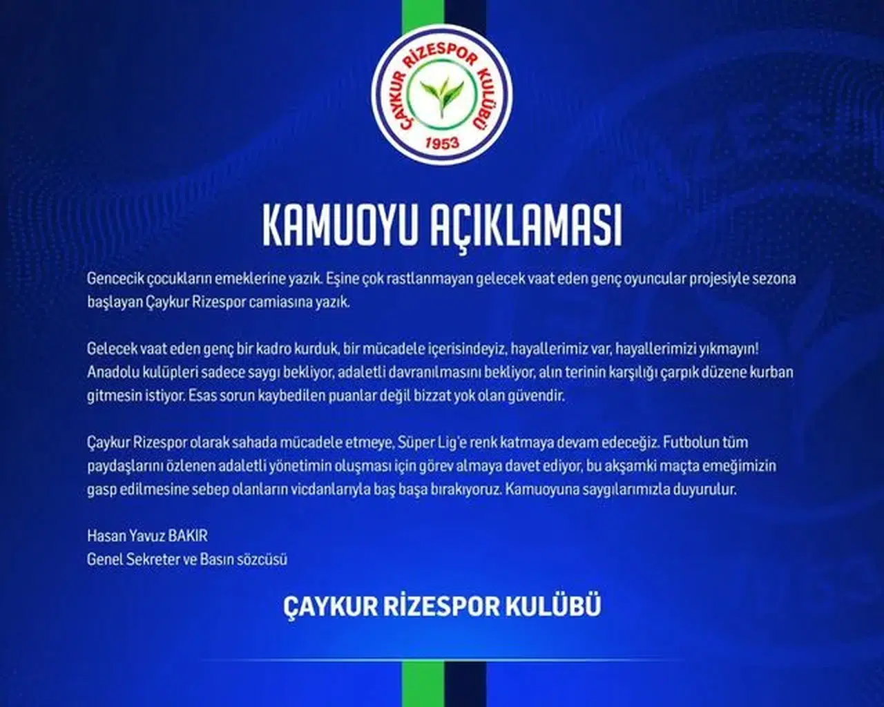 "Çaykur Rizespor olarak sahada mücadele etmeye, Süper Lig'e renk katmaya devam edeceğiz. Futbolun tüm paydaşlarını özlenen adaletli yönetimin oluşması için görev almaya davet ediyor, bu akşamki maçta emeğimizin gasp edilmesine sebep olanların vicdanlarıyla baş başa bırakıyoruz."