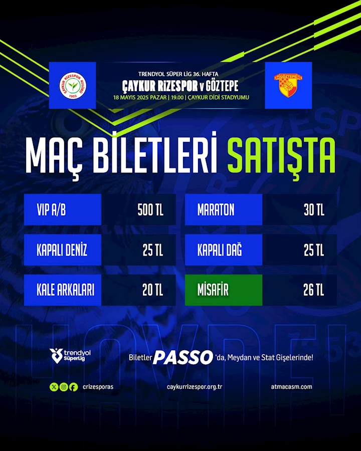 Süper Lig’in 36. haftasında Çaykur Rizespor ile Göztepe arasında oynanacak kritik karşılaşmanın biletleri satışa sunuldu.