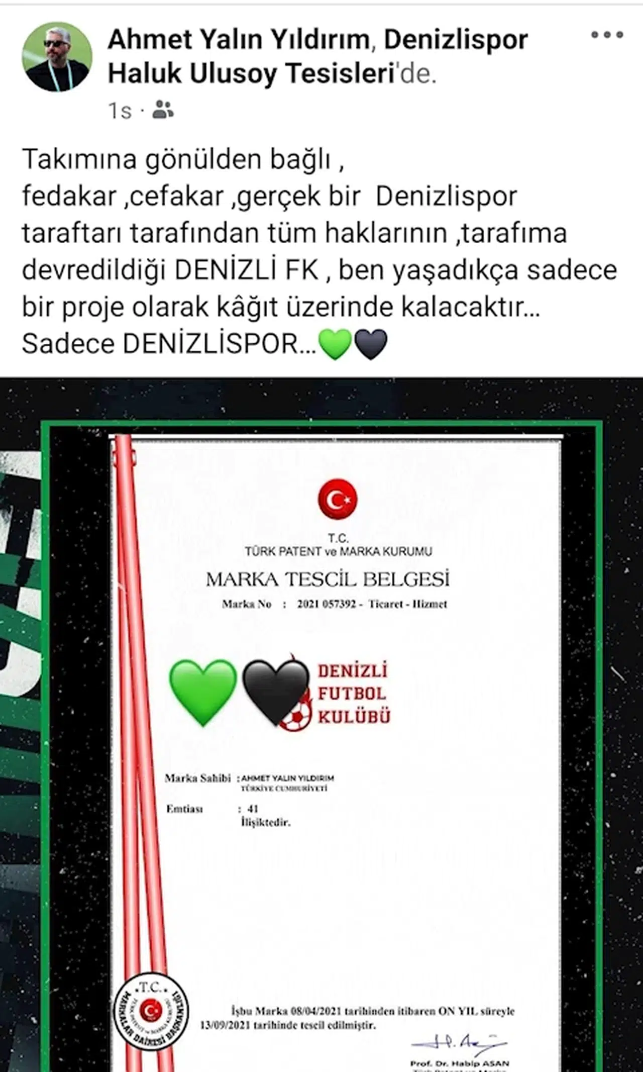 Denizlispor dışında başka bir isimle yeni bir kulüp kurulmasına karşı olduğunu aylardır belirten Ahmet Yalın Yıldırım, Denizli FK isminin marka tescil belgesini alarak bu isimle başkası tarafından kurulacak olan bir kulübün önüne geçmiş oldu. Sosyal medya hesabından Türkiye Cumhuriyeti Türk Marka ve Patent Kurumu'ndan alınan Denizli FK marka tescil belgesini paylaşarak açıklama yapan Başkan Yıldırım, "Ben yaşadıkça bu proje sadece kağıt üzerinde kalacaktır" ifadelerini kullandı.