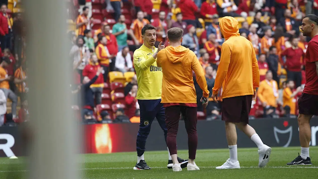 Süper Lig'in 37'nci haftasında saat 19.00'da başlayacak Galatasaray - Fenerbahçe derbisi öncesi saha içinde iki takım oyuncuları arasında gerginlik yaşandı. Fenerbahçeli futbolcular zemin kontrolü için maç öncesi sahaya çıkıp yarı alanda beklerken, diğer yarı alanda bulunan Mert Hakan Yandaş ile Galatasaraylı oyuncu Kerem Aktürkoğlu arasında sözlü atışma oldu. Galatasaraylı futbolcu Abdülkerim Bardakcı'nın da tartışmaya dahil olmasıyla gerginlik büyüdü. İtiş kakışın yaşandığı gerginlik teknik ekip ve diğer futbolcuların araya girmesiyle son buldu.