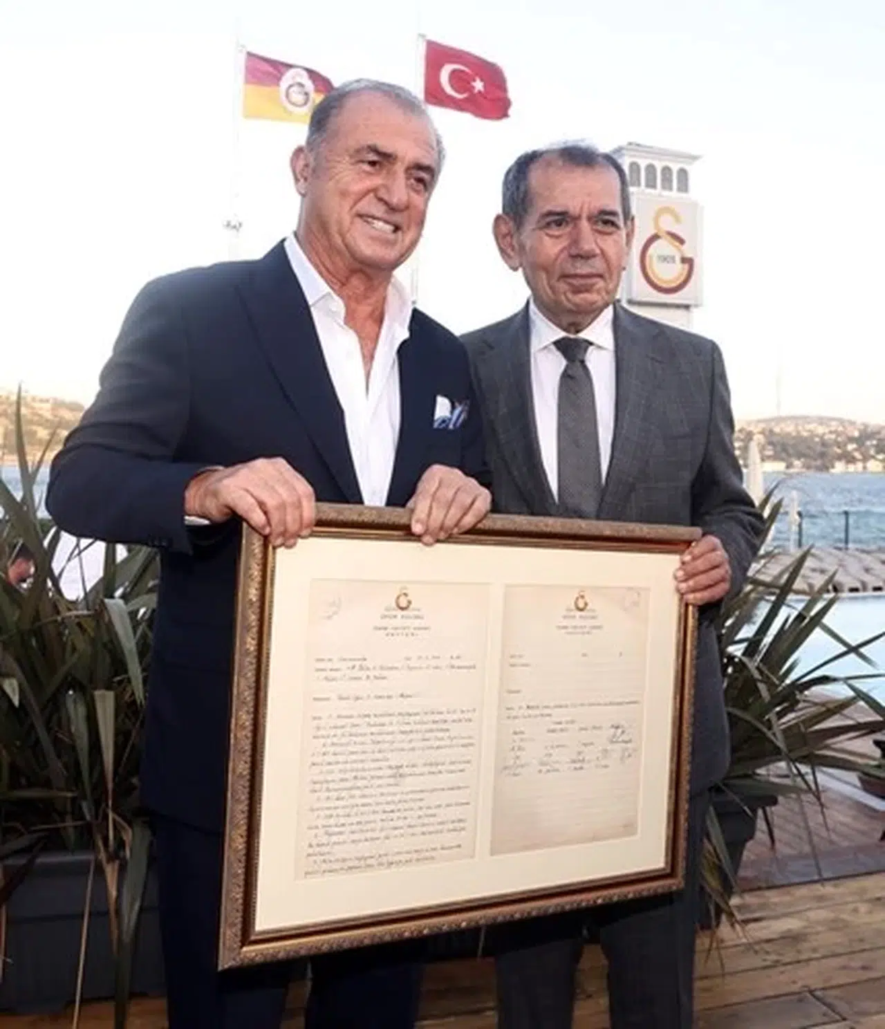 Başkan Dursun Özbek, günün anısına Fatih Terim'in 50 yıl önceki transferi konusunda kulübün yönetim kurulunda alınan kararın belgesini hediye etti.