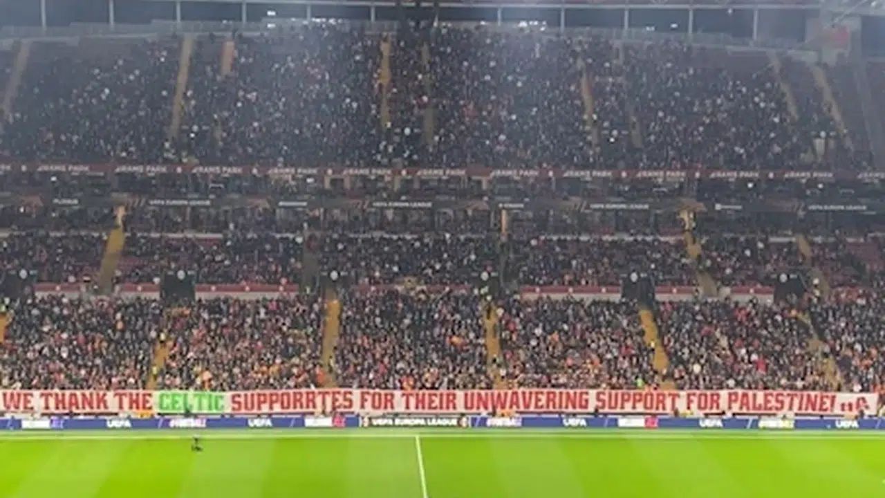 İskoçya ekibi Celtic’in taraftarları hemen hemen tüm karşılaşmalarında yaptıkları koreografi ve oluşturdukları tribün ambiyanslarıyla İsrail’in işgali altındaki Filistin’e destek mesajları veriyordu. Galatasaray taraftarları da AZ Alkmaar maçında Doğu Tribünü’nde açtıkları pankartlarla Celtic taraftarlarına teşekkür etti. Sarı-kırmızılı taraftarlar, Doğu Tribünü’nde açılan pankartta, “Filistin’e olan sarsılmaz destekleri için Celtic taraftarlarına teşekkür ediyoruz” ifadelerine yer verdi. Ayrıca kale arkasında yer alan tribünlerde de ‘Filistin’deki soykırımı durdurun’ ve ‘Filistin özgür değilse, dünya tutsaktır’ yazılı pankartlara yer verildi.