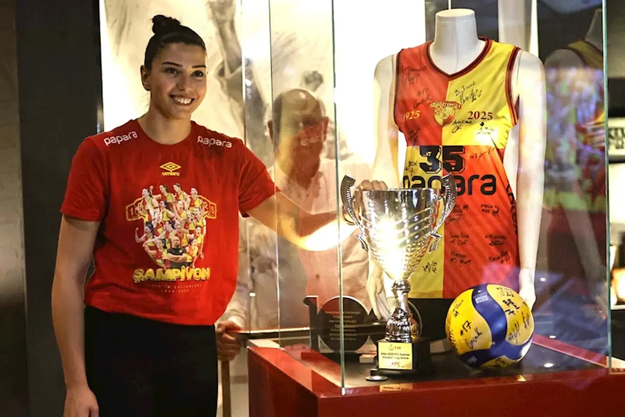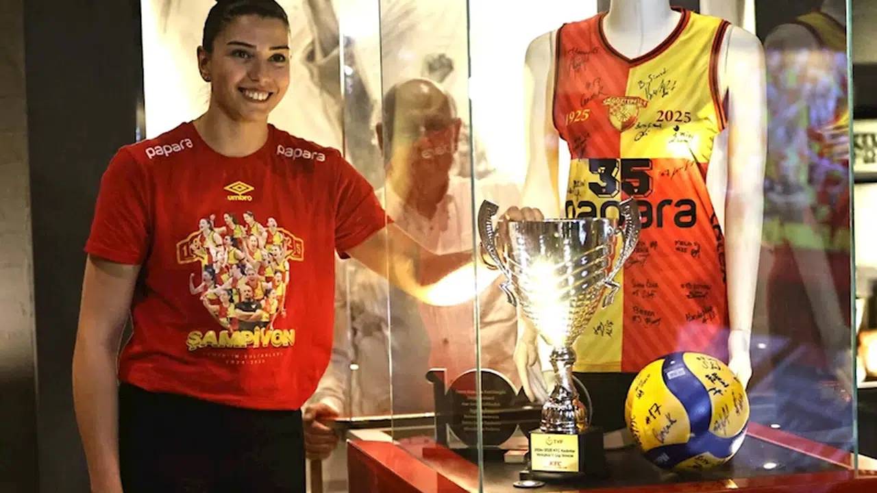 Onur ATIŞ / İZMİR, (DHA)- SULTANLAR Ligi'ne yükselmeyi başaran Papara Göztepe Kadın Voleybol Takımı'nın şampiyonluk kupası Gürsel Aksel Stadı'ndaki yerini aldı. KFC Kadınlar 1'inci Ligi’nde geçirdiği başarılı sezonun ardından final grubunda da rakiplerini geride bırakıp Alanya'da Sultanlar Ligi’ne yükselen sarı-kırmızılılar, kupayla birlikte stattaki müzeye geldi. Törenle müzeye koyulan kupa, sporseverlerden büyük ilgi gördü.
