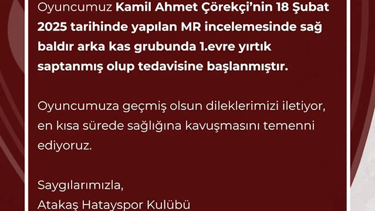 Samim SELÇUK/ HATAY, (DHA) – SÜPER Lig ekiplerinden Hatayspor’da takım kaptanı Kamil Ahmet Çörekçi’nin sağ baldır arka kas grubunda 1'inci evre yırtık tespit edildiği açıklandı.