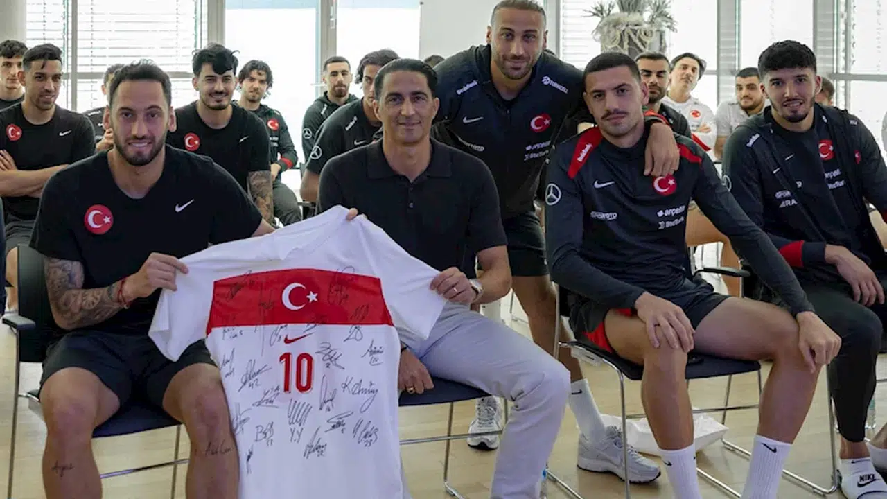 Takım kaptanı Hakan Çalhanoğlu, sunumun ardından Gözübüyük'e A Millî Takım oyuncularının imzaladığı bir forma hediye etti.