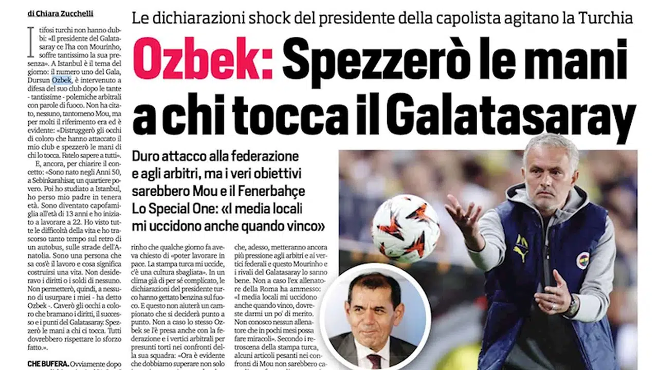 İSTANBUL, (DHA) - İtalyan spor basını, Galatasaray Başkanı Dursun Özbek'in "Galatasaray'ın hakkına, başarısına, puanlarına göz dikenlerin gözünü çıkarırım! El sürenlerin, elini kırarım!" sözlerini manşetlerine taşıdı.