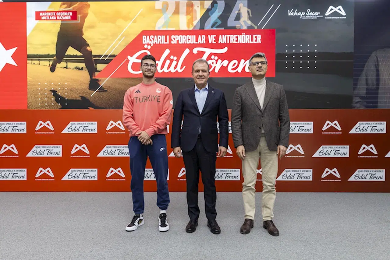 Mersin Büyükşehir Belediye Başkanı Vahap Seçer, Büyükşehir Belediyesi Gençlik ve Spor Hizmetleri Dairesi Başkanlığı tarafından, ‘Harekete Geçenler Mutlaka Kazanır’ sloganıyla düzenlenen Başarılı Sporcular ve Antrenörler Ödül Töreni’ne katıldı. Kongre ve Sergi Sarayı Meclis Salonu’nda düzenlenen ödül töreninde Paris 2024 Olimpiyat Oyunları’nda takım arkadaşı ile 10 metre havalı tabanca karışık kategorisinde gümüş madalya kazanan ve atış sırasındaki tarzıyla tüm dünyada adından söz ettiren milli sporcu Yusuf Dikeç ile Paris 2024 Olimpiyat Oyunları’nda erkekler sırıkla atlamada olimpiyat beşincisi olan Ersu Şaşma ve Kır Çiçekleri’nden de 7 kişi ödül aldı.