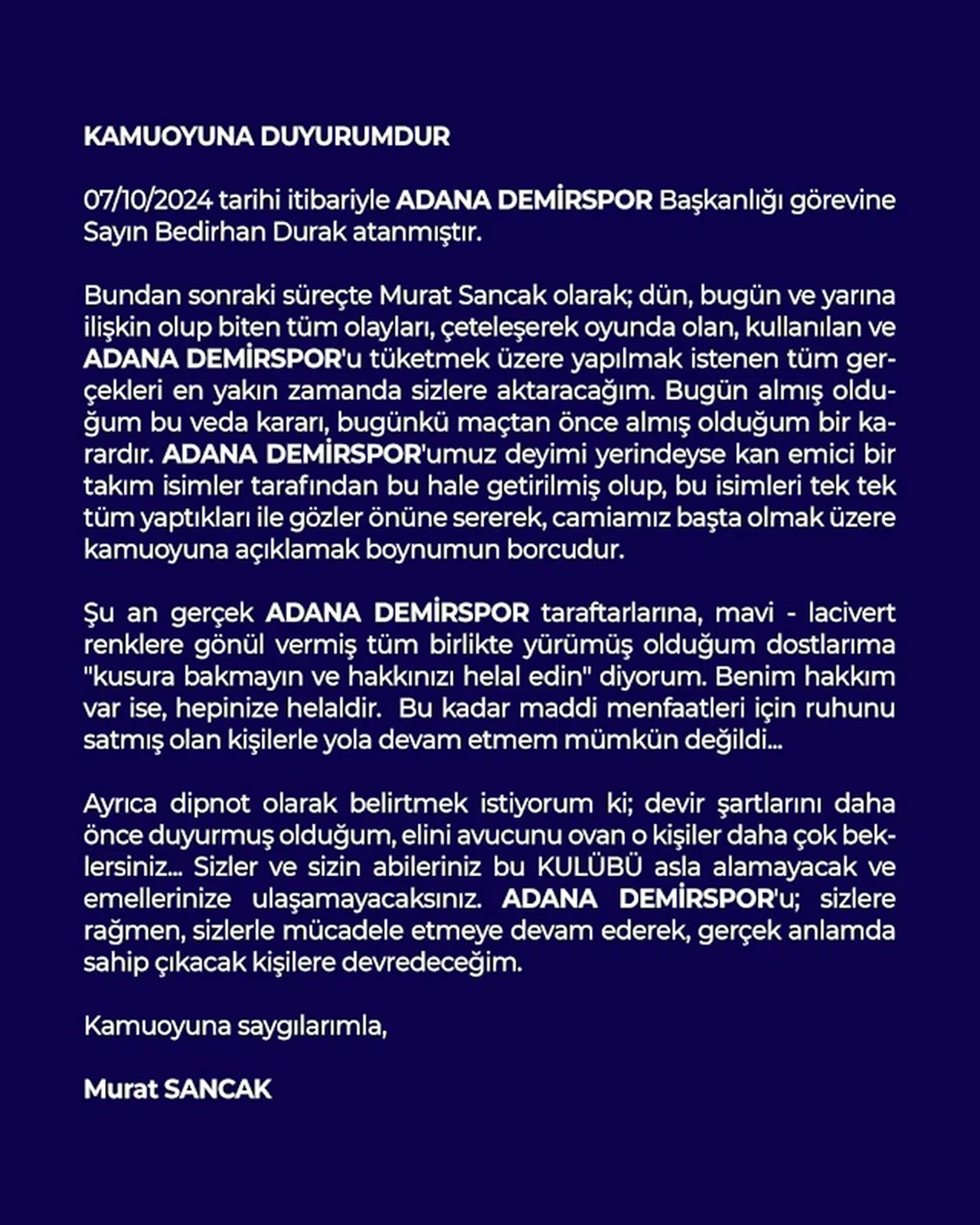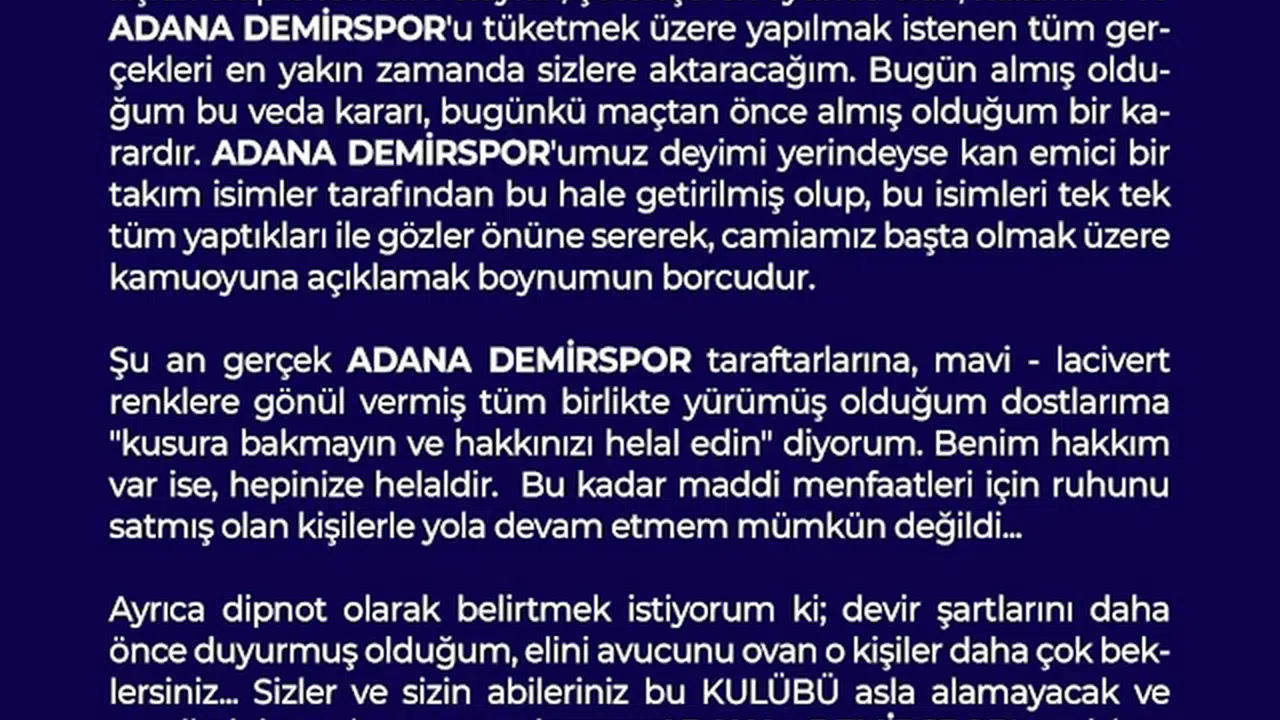 "Bundan sonraki süreçte Murat Sancak olarak; dün, bugün ve yarına ilişkin olup biten tüm olaylar, çeteleşerek oyunda olan, kullanılan ve Adana Demirspor'u tüketmek üzere yapılmak istenen tüm gerçekleri en yakın zamanda sizlere aktaracağım. Bugün almış olduğum bu veda kararı, bugünkü maçtan önce almış olduğum bir karardır. Adana Demirspor'umuz deyim yerindeyse kan emici bir takım isimler tarafından bu hale getirilmiş olup, bu isimleri tek tek tüm yaptıkları ile gözler önüne sererek, camiamız başta olmak üzere kamuoyuna açıklamak boynumun borcudur. Şu an gerçek Adana Demirspor taraftarlarına, mavi -lacivert renklere gönül vermiş, tüm birlikte yürümüş olduğum dostlarıma 'Kusura bakmayın ve hakkınızı helal edin' diyorum. Benim hakkım var ise, hepinize helaldir. Bu kadar maddi menfaatleri için ruhunu satmış olan kişilerle yola devam etmem mümkün değildi. Ayrıca dipnot olarak belirtmek istiyorum ki; devir şartlarını daha önce duyurmuş olduğum, elini avucunu ovan o kişiler daha çok beklersiniz. Sizler ve sizin abileriniz bu kulübü asla alamayacak ve emellerinize ulaşamayacaksınız. Adana Demirspor'u sizlere