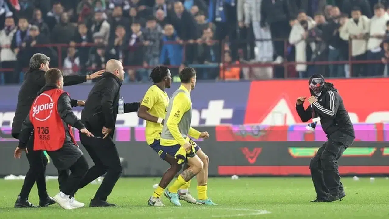 Trabzonspor - Fenerbahçe maçının özellikle ikinci yarısında tribünden atılan yabancı maddeler sonrası oyun 3 dakika durdu. Karşılaşmanın bitiş düdüğü sonrası Papara Park Stadyumu'nda istenmeyen olaylar yaşandı. Sarı-lacivertli futbolcuların orta sahadaki galibiyet sevinci sırasında bazı bordo-mavili taraftarların sahaya girmesiyle tekme ve yumruklar havada uçuştu. Sahaya inen bazı taraftarlar, ellerine aldığı korner direğiyle Fenerbahçeli oyunculara doğru koştu.