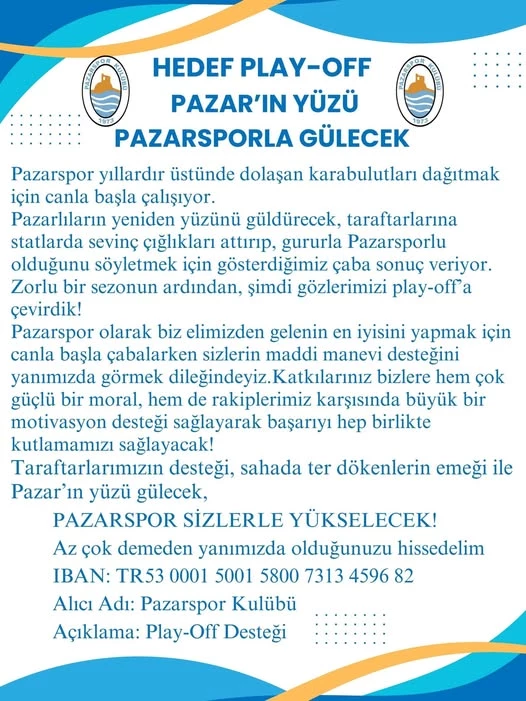 Pazarspor yönetimi tarafından yapılan açıklamada, takımın play-off hedefi doğrultusunda çok önemli bir döneme girdiği belirtilerek, “Bu kritik süreçte takımımıza moral ve motivasyon sağlayabilmek adına maddi desteğinize ihtiyacımız var. Tüm taraftarlarımızı, iş insanlarımızı ve Pazarspor gönüllülerini bu mücadelede yanımıza olmaya davet ediyoruz,” ifadelerine yer verildi.