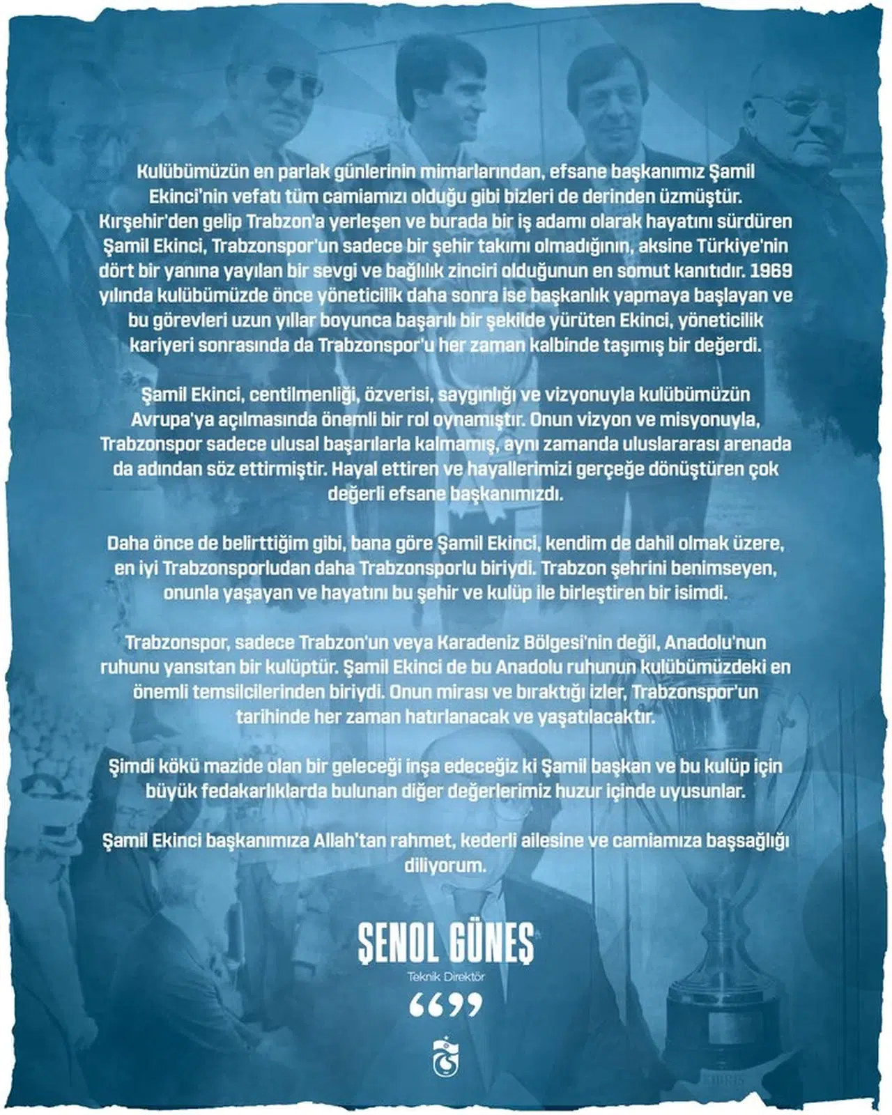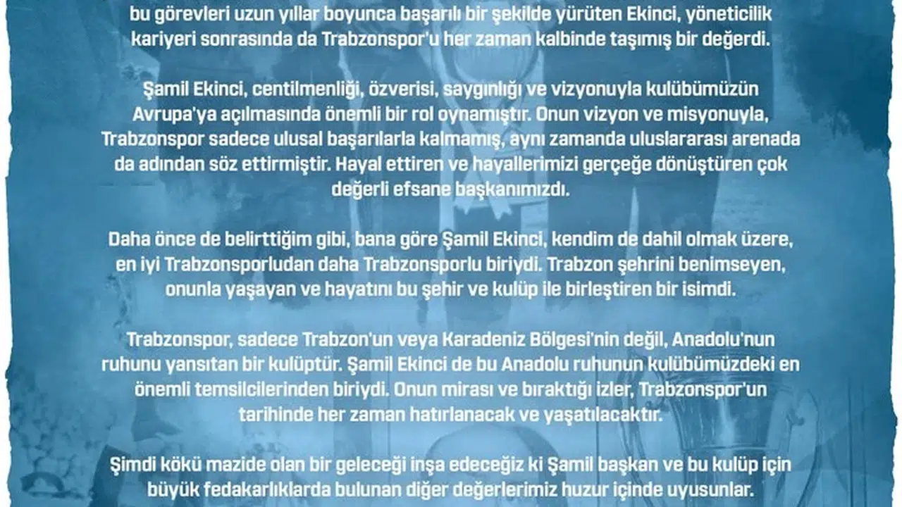 "Kulübümüzün en parlak günlerinin mimarlarından, efsane başkanımız Şamil Ekinci’nin vefatı tüm camiamızı olduğu gibi bizleri de derinden üzmüştür. Kırşehir'den gelip Trabzon'a yerleşen ve burada bir iş adamı olarak hayatını sürdüren Şamil Ekinci, Trabzonspor'un sadece bir şehir takımı olmadığının, aksine Türkiye'nin dört bir yanına yayılan bir sevgi ve bağlılık zinciri olduğunun en somut kanıtıdır. 1969 yılında kulübümüzde önce yöneticilik daha sonra ise başkanlık yapmaya başlayan ve bu görevleri uzun yıllar boyunca başarılı bir şekilde yürüten Ekinci, yöneticilik kariyeri sonrasında da Trabzonspor'u her zaman kalbinde taşımış bir değerdi. Şamil Ekinci, centilmenliği, özverisi, saygınlığı ve vizyonuyla kulübümüzün Avrupa'ya açılmasında önemli bir rol oynamıştır. Onun vizyon ve misyonuyla, Trabzonspor sadece ulusal başarılarla kalmamış, aynı zamanda uluslararası arenada da adından söz ettirmiştir. Hayal ettiren ve hayallerimizi gerçeğe dönüştüren çok değerli efsane başkanımızdı. Daha önce de belirttiğim gibi, bana göre Şamil Ekinci, kendim de dahil olmak üzere, en iyi Trabzonsporludan daha Trabzonsporlu biriydi. Trabzon şehrini benimseyen, onunla yaşayan ve hayatını bu şehir ve kulüp ile birleştiren bir isimdi. Trabzonspor, sadece Trabzon'un veya Karadeniz Bölgesi'nin değil, Anadolu'nun ruhunu yansıtan bir kulüptür. Şamil Ekinci de bu Anadolu ruhunun kulübümüzdeki en önemli temsilcilerinden biriydi. Onun mirası ve bıraktığı izler, Trabzonspor'un tarihinde her zaman hatırlanacak ve yaşatılacaktır. Şimdi kökü mazide olan bir geleceği inşa edeceğiz ki Şamil başkan ve bu kulüp için büyük fedakarlıklarda bulunan diğer değerlerimiz huzur içinde uyusunlar. Şamil Ekinci başkanımıza Allah’tan rahmet, kederli ailesine ve camiamıza başsağlığı diliyorum."