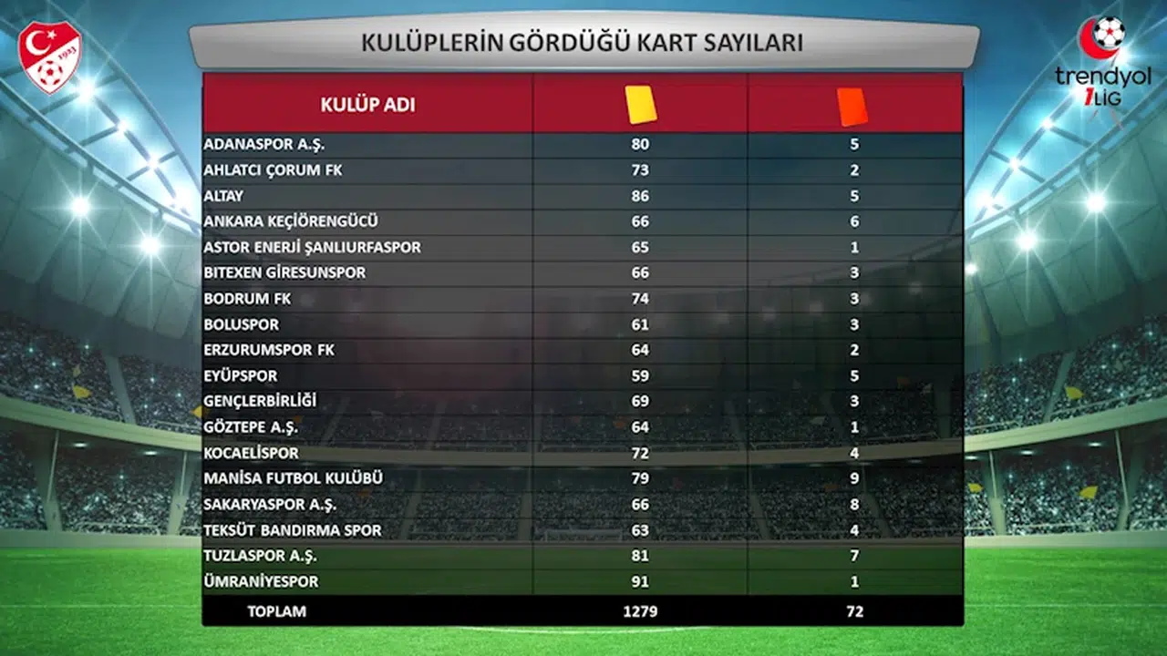 En çok sarı kart gören takım Ümraniyespor oldu. İstanbul temsilcisi, 91 kez sarı kart gördü. Sezon boyunca en az sarı kartla Eyüpspor cezalandırıldı. Eyüpspor 59 kez sarı kart gördü. Hakemler toplam bin 279 kez sarı kartına başvururken, 72 kez ise kırmızı kartını kullandı.