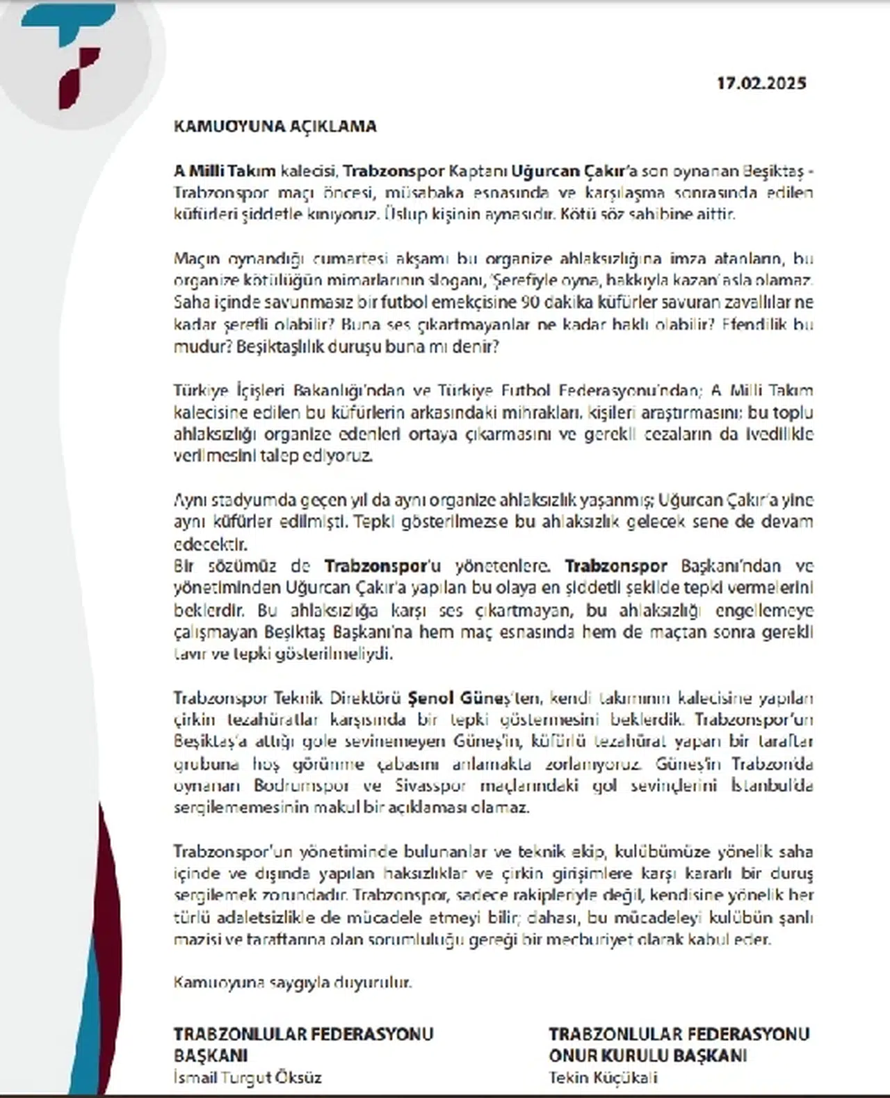 Trabzonlular Federasyonu'ndan Uğurcan Çakır, Beşiktaş ve Şenol Güneş için açıklama