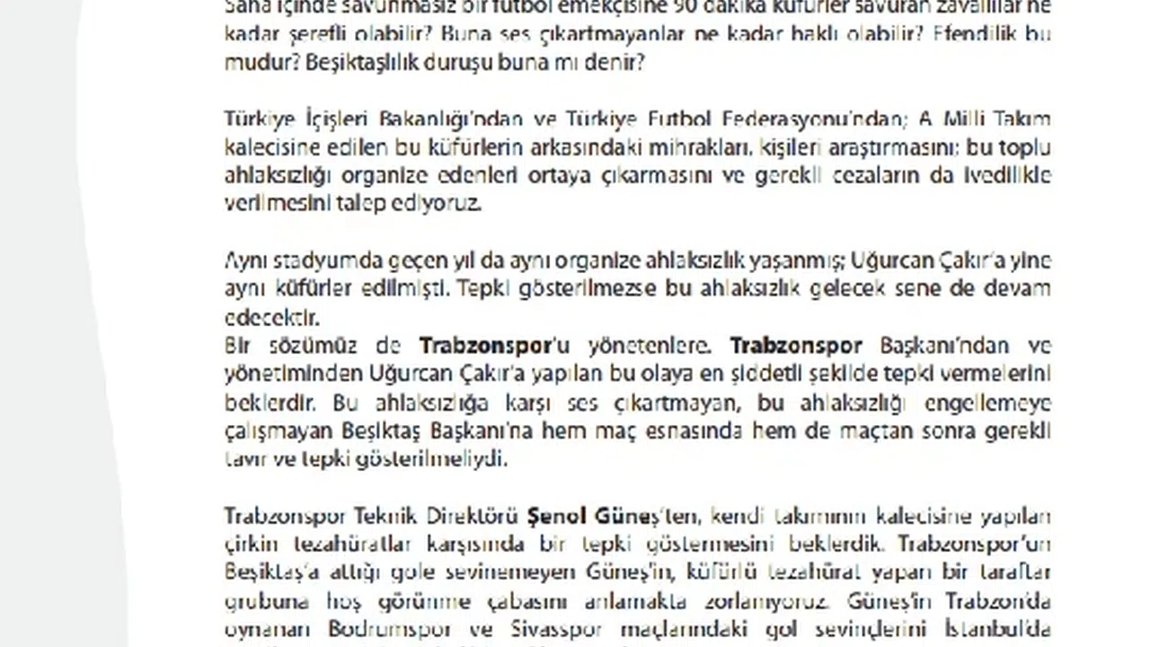 küfürleri şiddetle kınıyoruz. Üslup kişinin aynasıdır. Kötü söz sahibine aittir. Maçın oynandığı cumartesi akşamı bu organize ahlaksızlığına imza atanların, bu organize kötülüğün mimarlarının sloganı, ‘Şerefiyle oyna, hakkıyla kazan’ asla olamaz. Saha içinde savunmasız bir futbol emekçisine 90 dakika küfürler savuran zavallılar ne kadar şerefli olabilir? Buna ses çıkartmayanlar ne kadar haklı olabilir? Efendilik bu mudur? Beşiktaşlılık duruşu buna mı denir? Türkiye İçişleri Bakanlığı’ndan ve Türkiye Futbol Federasyonu’ndan; A Milli Takım kalecisine edilen bu küfürlerin arkasındaki mihrakları, kişileri araştırmasını; bu toplu ahlaksızlığı organize edenleri ortaya çıkarmasını ve gerekli cezaların da ivedilikle verilmesini talep ediyoruz.