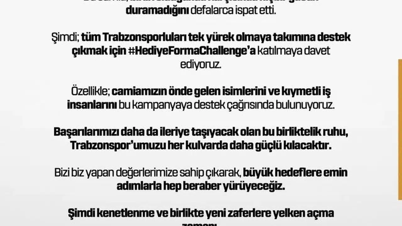 "Büyük Trabzonspor camiası. Bu camia; birlik olduğunda karşısında hiçbir gücün duramadığını defalarca ispat etti. Şimdi; tüm Trabzonsporluları tek yürek olmaya takımına destek çıkmak için '#HediyeFormaChallenge'a katılmaya davet ediyoruz. Özellikle; camiamızın önde gelen isimlerini ve kıymetli iş insanlarını bu kampanyaya destek çağrısında bulunuyoruz. Başarılarımızı daha da ileriye taşıyacak olan bu birliktelik ruhu, Trabzonsporumuz'u her kulvarda daha güçlü kılacaktır. Bizi biz yapan değerlerimize sahip çıkarak, büyük hedeflere emin adımlarla hep beraber yürüyeceğiz. Şimdi kenetlenme ve birlikte yeni zaferlere yelken açma zamanı. #YaşasınBüyükTrabzonspor"