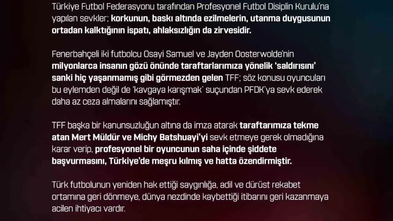 "Türkiye Futbol Federasyonu tarafından Profesyonel Futbol Disiplin Kurulu’na yapılan sevkler; korkunun, baskı altında ezilmelerin, utanma duygusunun ortadan kalktığının ispatı, ahlaksızlığın da zirvesidir.