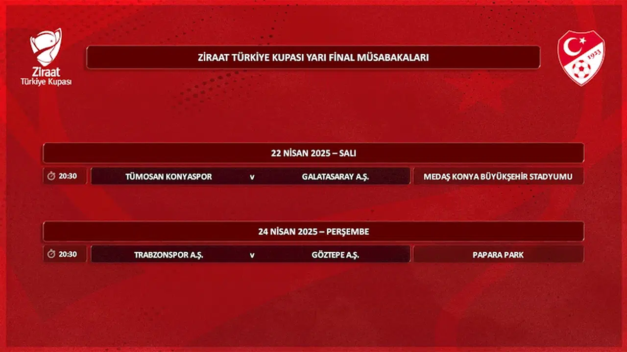 İSTANBUL,(DHA)- TÜRKİYE Kupası’nda Konyaspor ve Galatasaray ile Trabzonspor ve Göztepe’yi karşı karşıya getirecek yarı final müsabakalarının tarihleri belli oldu.