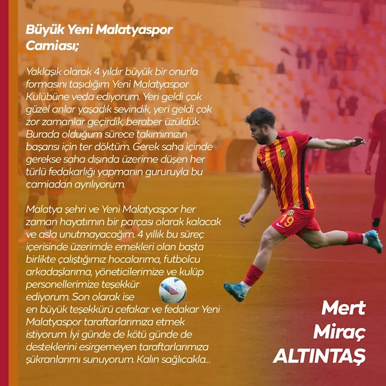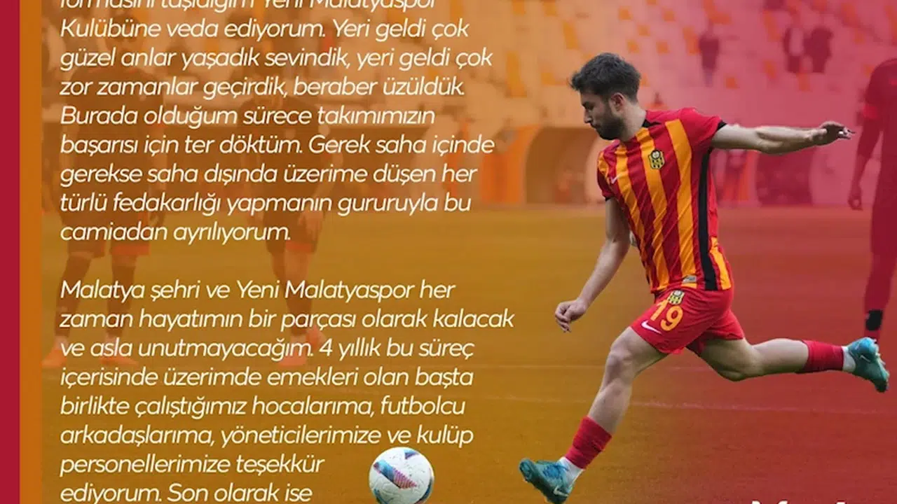Recep BAĞDAT/MALATYA,(DHA)- YENİ Malatyaspor'un santrafor oyuncusu Mert Miraç Altındaş, sosyal medya hesabından yaptığı paylaşımla Yeni Malatyaspor Kulübüne veda etti.
